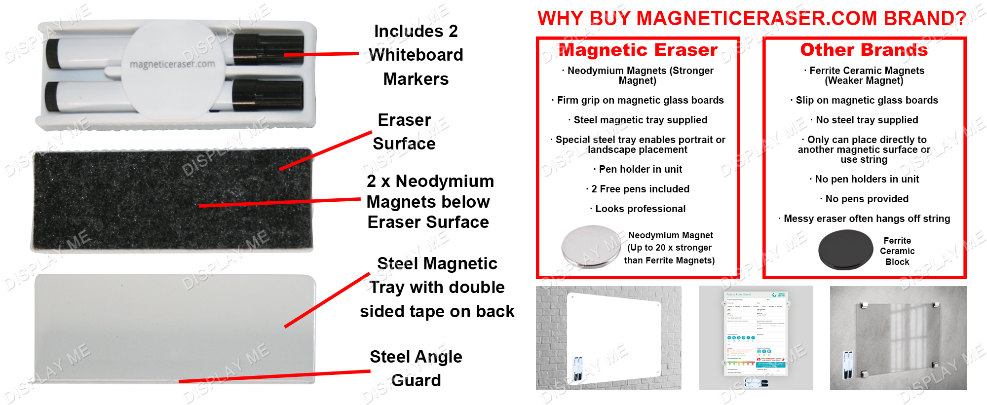 This whiteboard eraser is highly unique and believed to be one of its kind on the market as it contains Neodymium Iron Boron Magnets(rare earth magnets) giving it extra super hold strength onto the whiteboard or magnetic glass board as opposed to Ferrite Ceramic Block magnets which are your normal strength magnets. These Neodymium Magnets have super strength and your magnetic eraser will never slide or fall of the board.