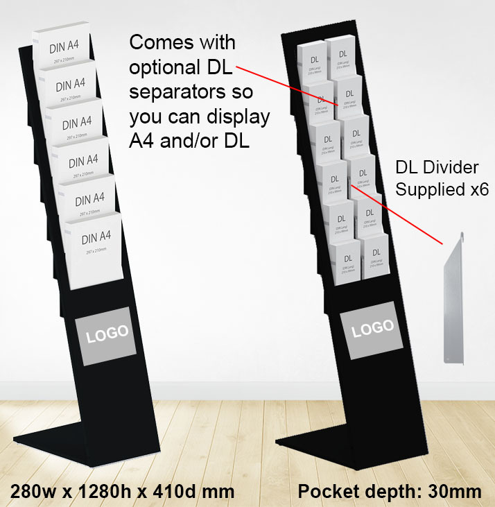 This literature display stand has 6 shelves. Each shelf holds A4 literature with a pocket depth of 30mm. It also comes with a DL separator which instantly transforms the A4 shelf into 2 DL sized holders.
