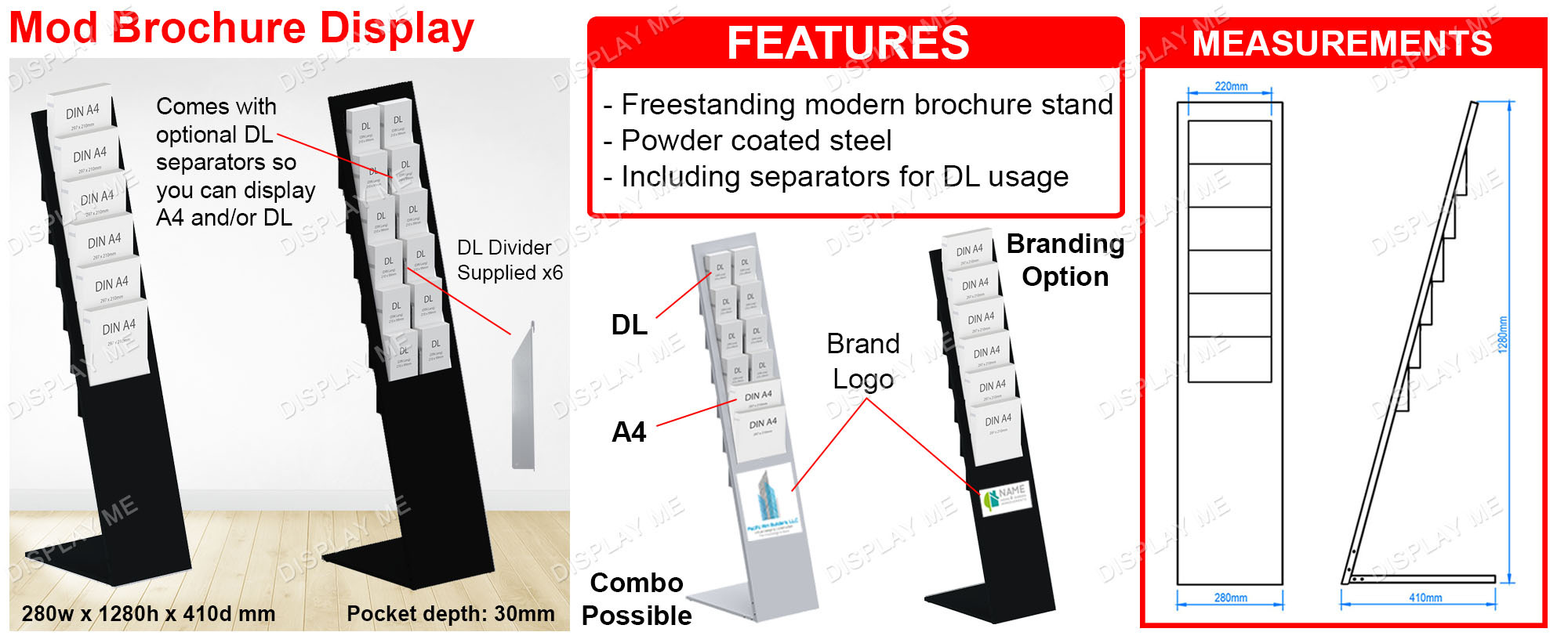 The Mod Brochure Holder is a modern unique Freestanding Brochure Holder that holds A4 and DL Brochure Holders.