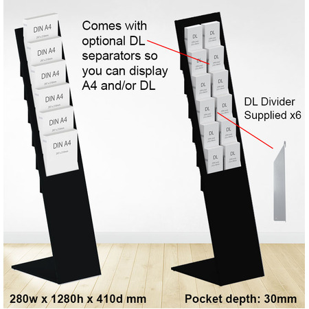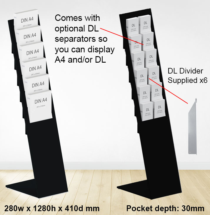 This literature display stand has 6 shelves. Each shelf holds A4 literature with a pocket depth of 30mm. It also comes with a DL separator which instantly transforms the A4 shelf into 2 DL sized holders.