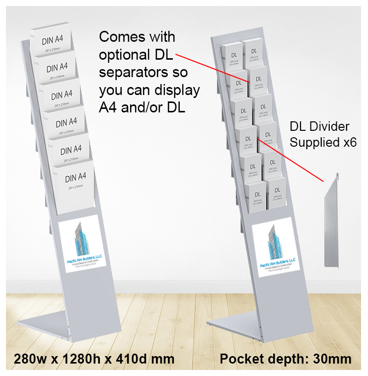 This literature display stand has 6 shelves. Each shelf holds A4 literature with a pocket depth of 30mm. It also comes with a DL separator which instantly transforms the A4 shelf into 2 DL sized holders.