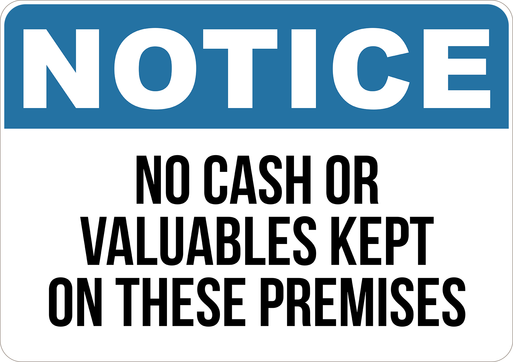 PRINTED ALUMINUM A4 SIGN - No Cash or Valuables Kept On These Premises Sign