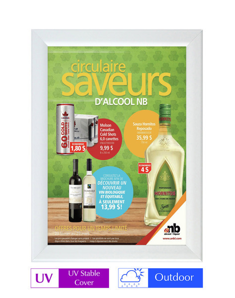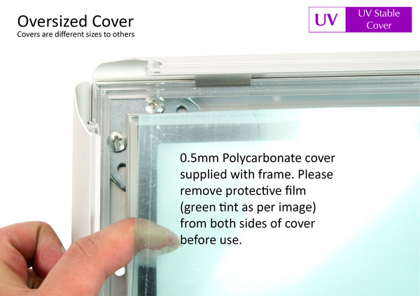 This silver square cornered A0 Outdoor snap frame clips open from the front and around all four sides. It has a weatherproof rubber seal to protect poster from rain and it also includes a weatherproof poly carb cover. .The clip frame system makes changing graphics easier without having to remove the frame from the wall each time. These poster frames are also called snap frames or clip frames. They can be displayed in portrait or landscape orientation and come supplied with mounting hardware. They are ideal for advertising as well as general signage for a smart, professional look for your businesses signage.