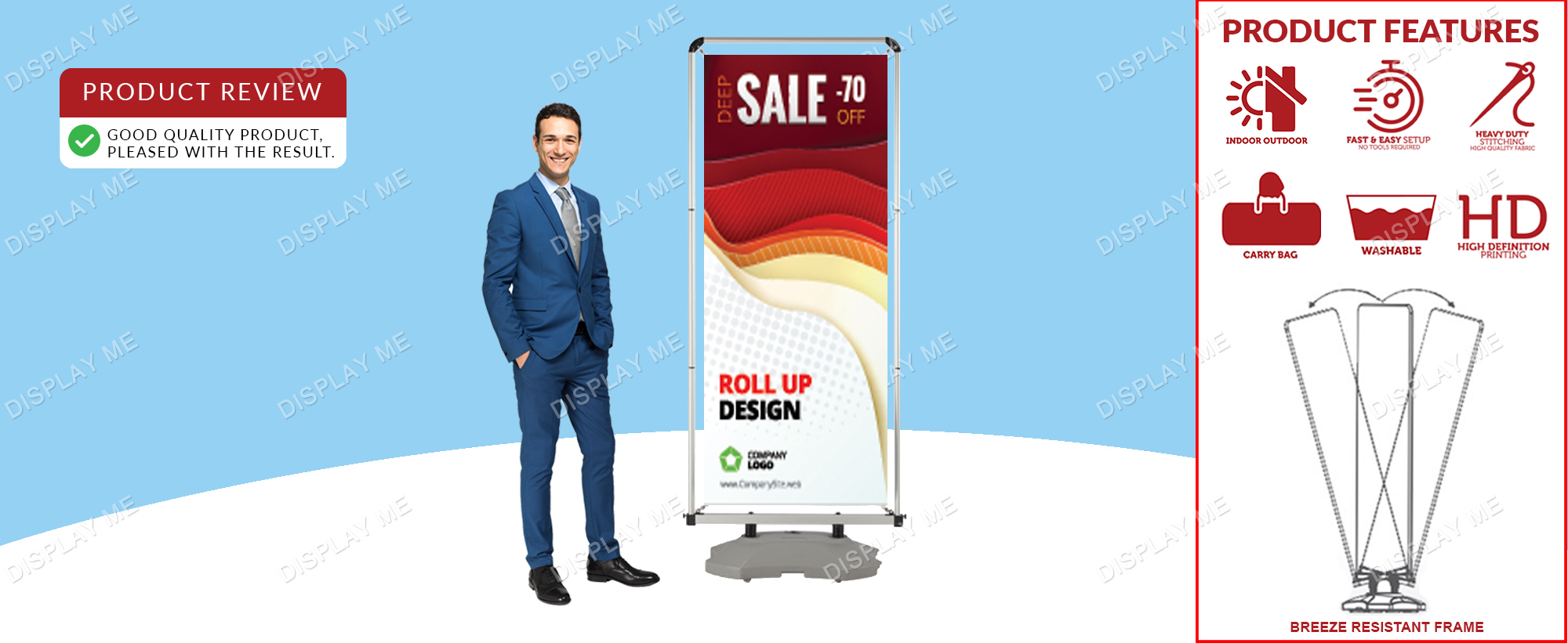 The Double Sided Outdoor Tension Banner is a strong and stable stand perfect for displaying your message outdoors. The tubular aluminium frame is easy to assemble with no tools required. Frame connects and is secured in place using a button clip system.