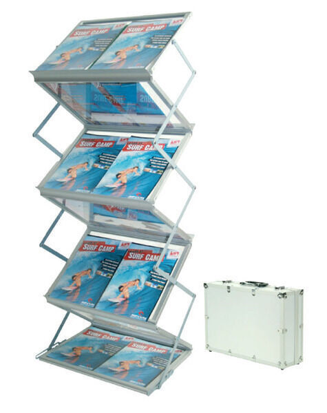 - The brochure stand can be folded and stored in its case without even having to take the brochures of the shelves.
