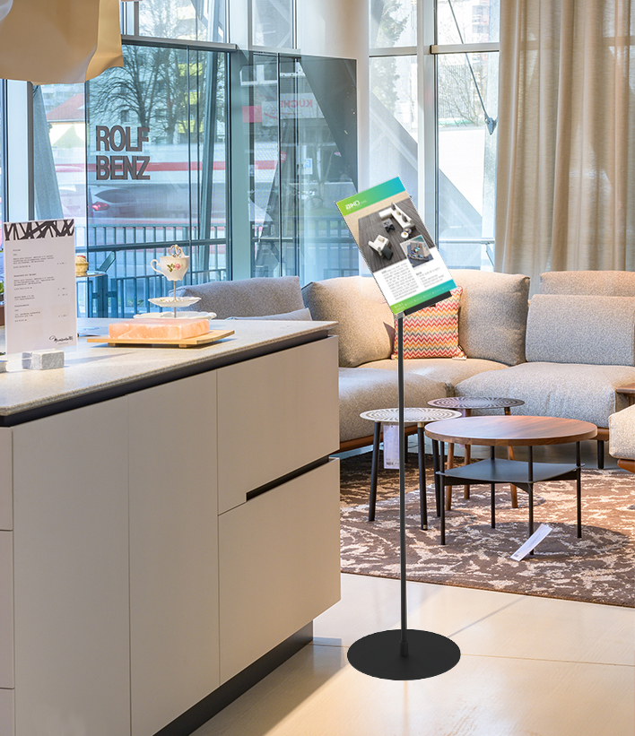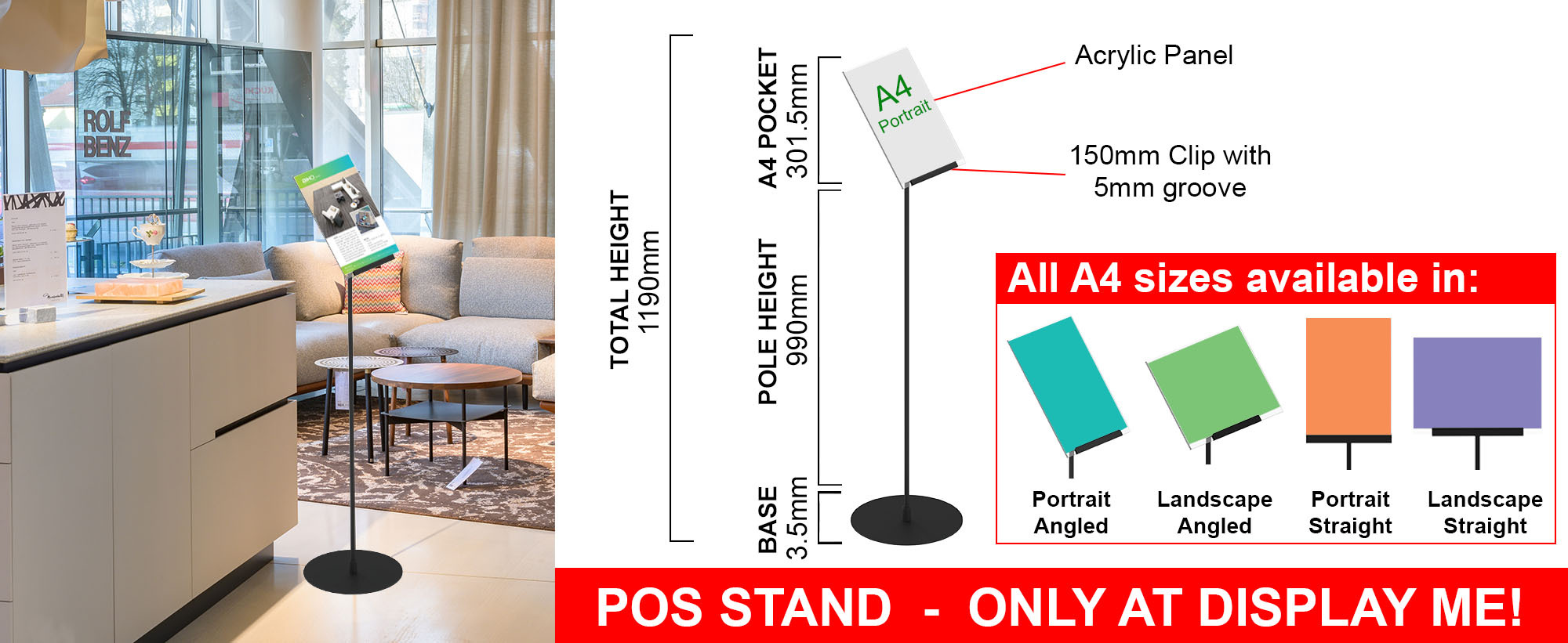 This POS Stand is ideal for displaying posters and information in a retail or fast paced environments such as furniture and appliance stores retail stores, supermarkets, department stores, car dealerships, cafes, newsagents, waiting rooms.