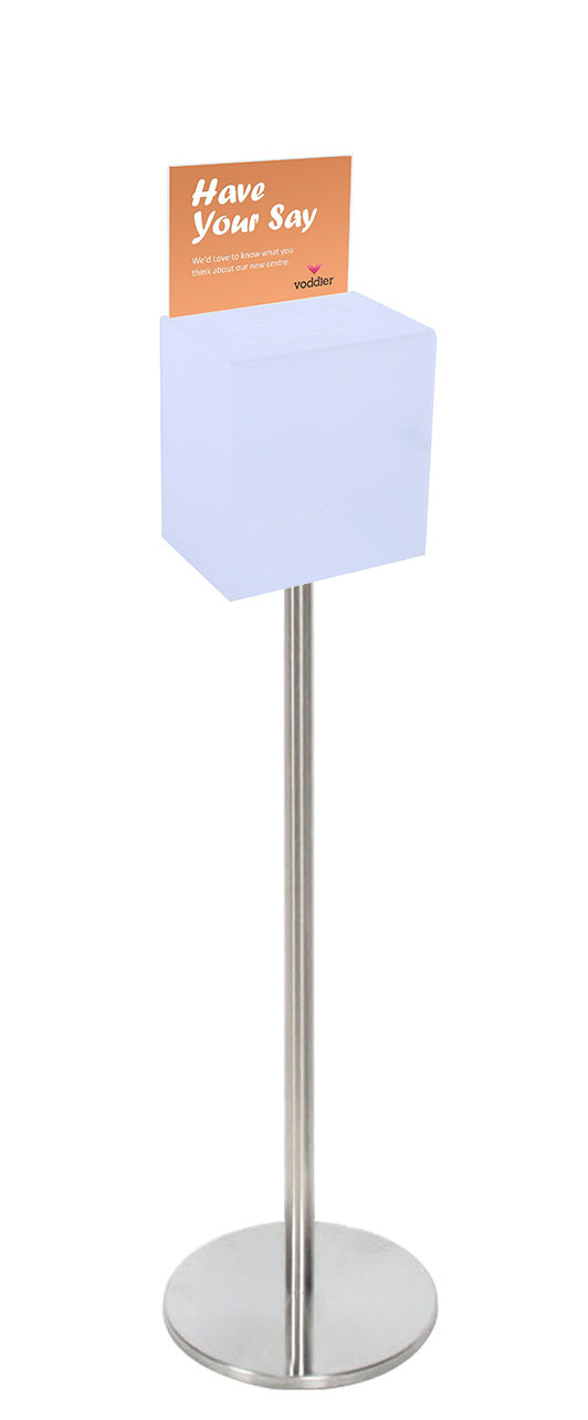 Premium Frosted Suggestion Box with A5 Display on Silver Pole and Base