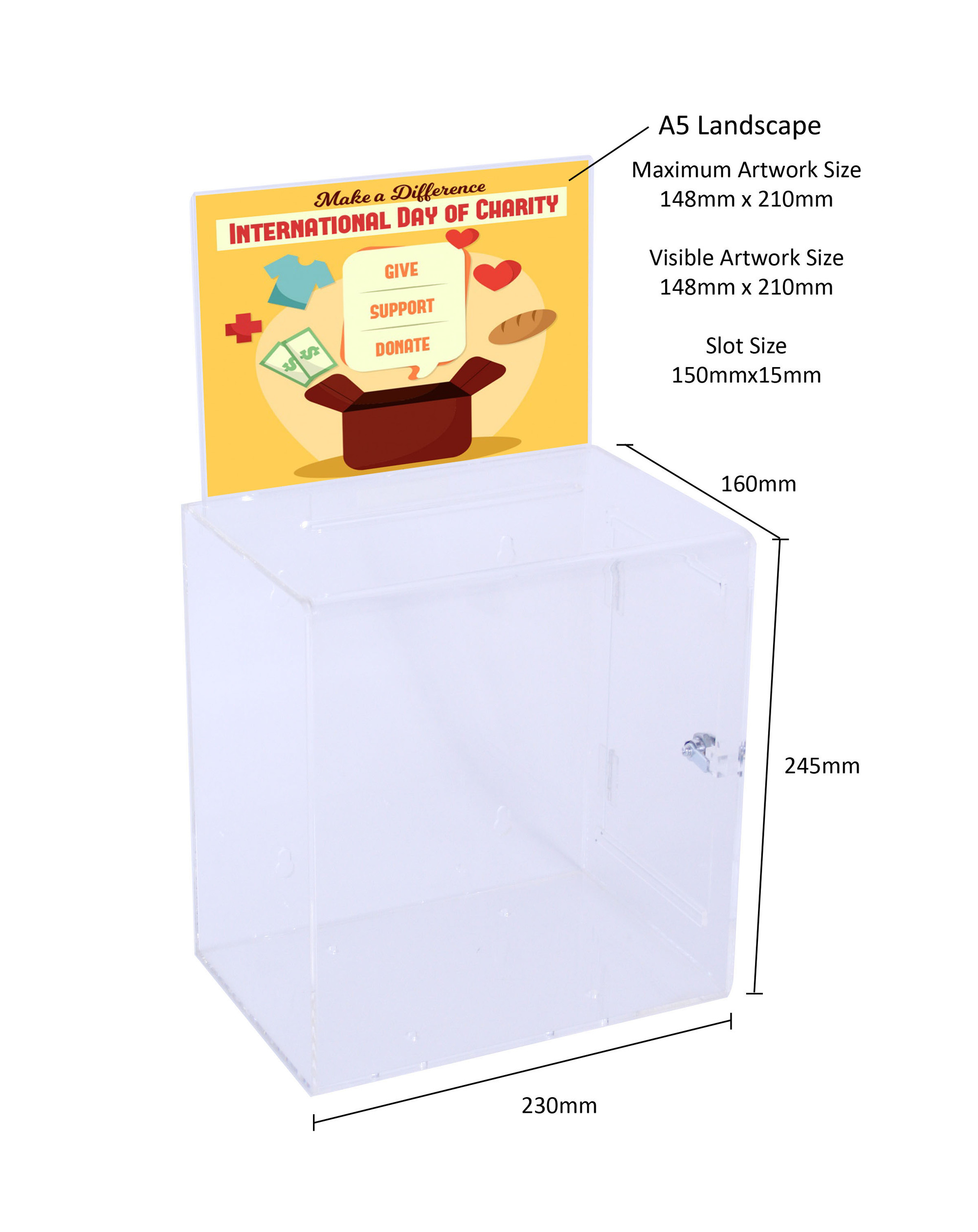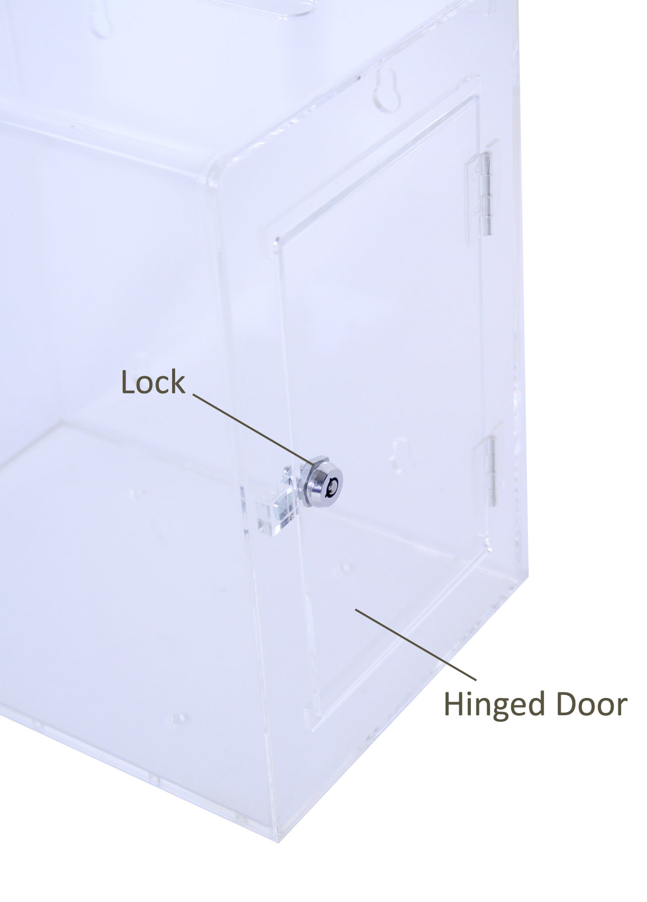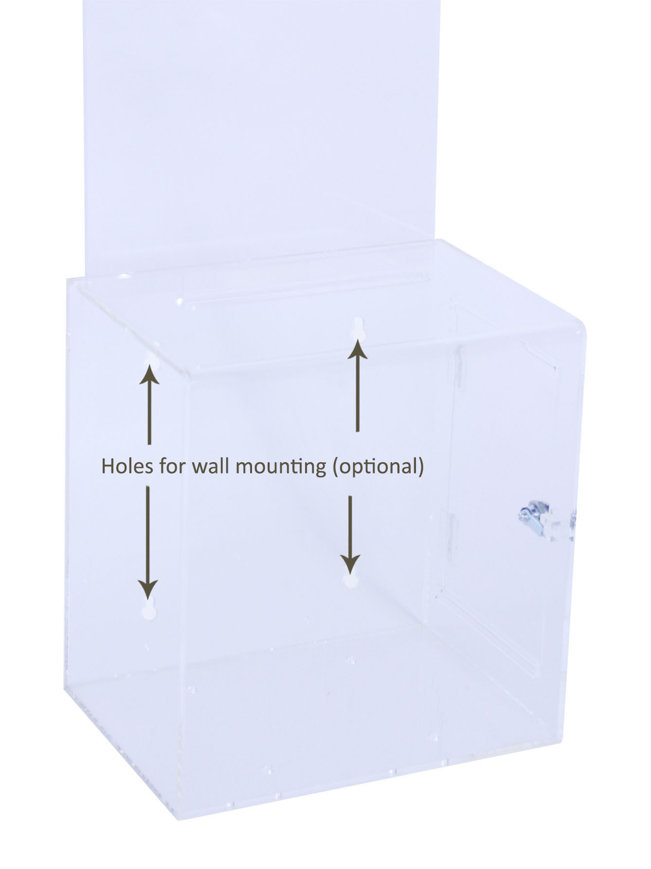 The suggestion box is made from 3mm thick high quality acrylic that has a crystal clear transparency. It comes with a clear acrylic sign holder.
