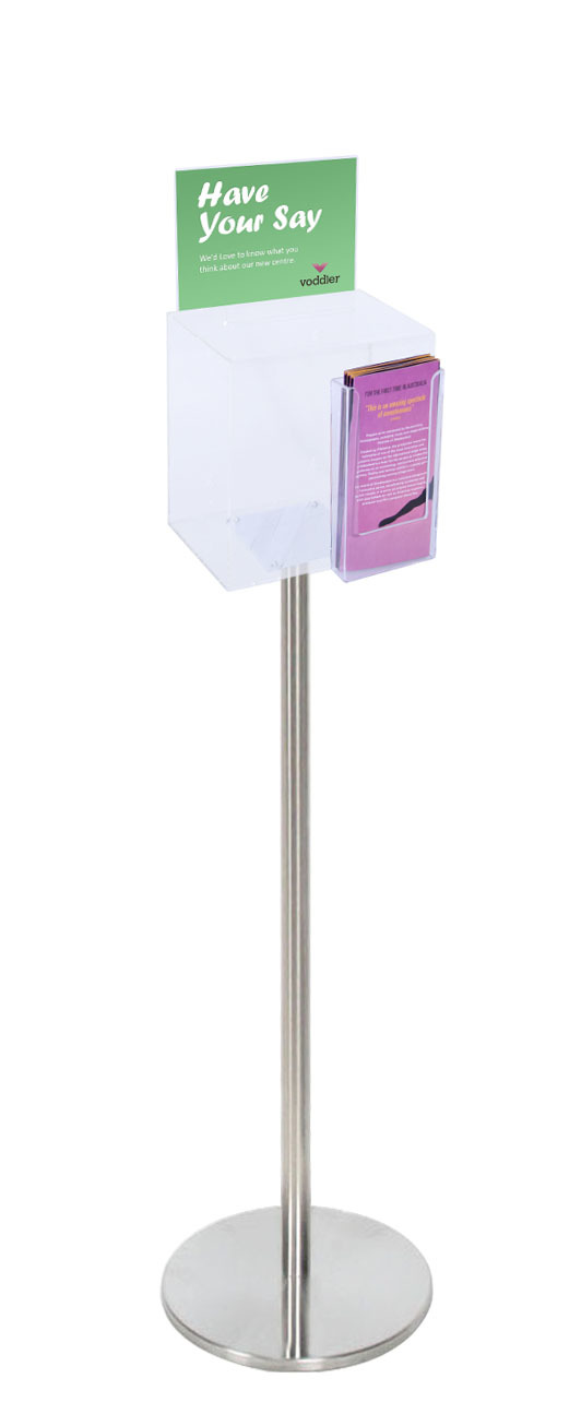 Premium Clear Suggestion Box with A5 Display on Silver Pole and Base with DL Brochure Holder