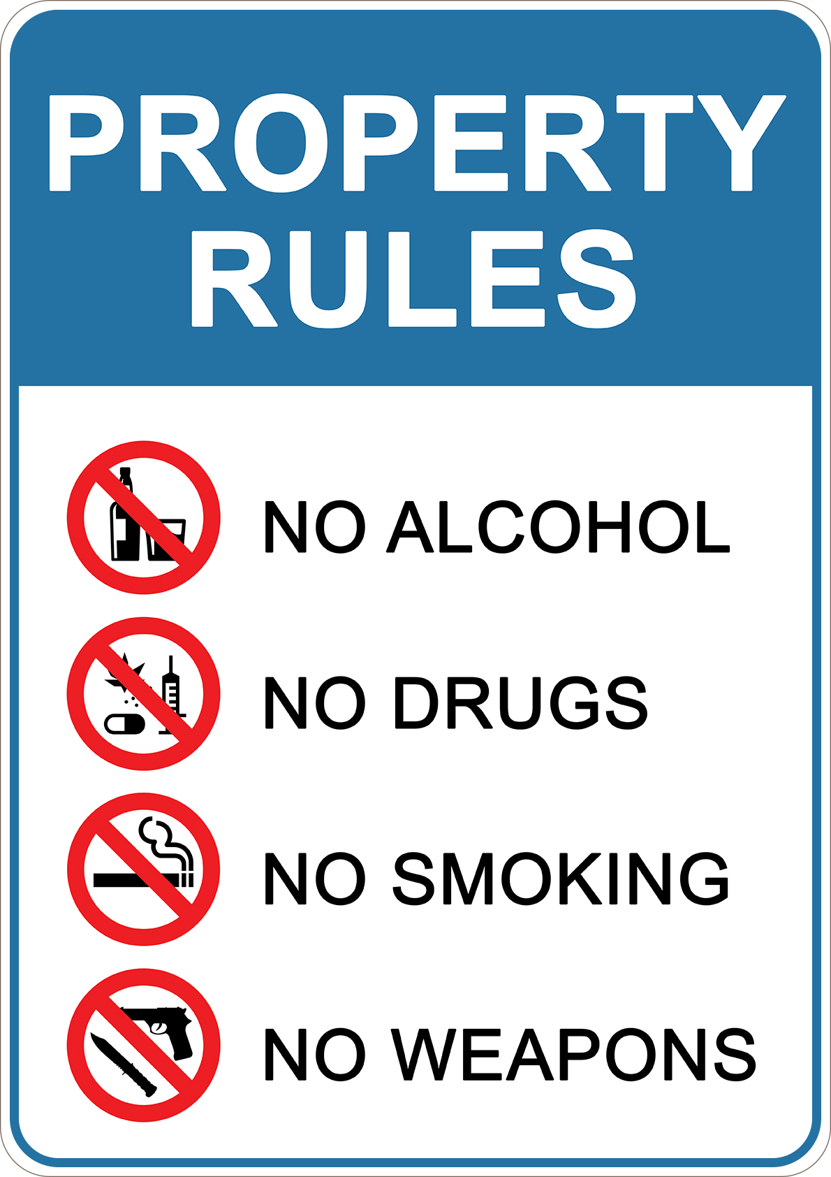 PRINTED ALUMINUM A2 SIGN - Property Rules No Alcohol No Drugs No Smoking No Weapons Sign
