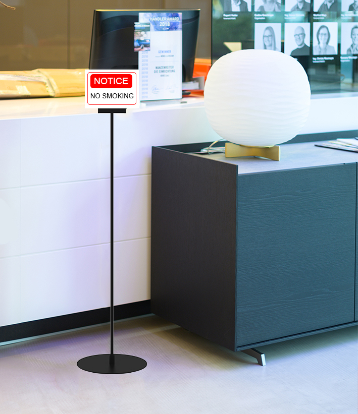 The acrylic frame is held securely inside an attachment holder that stands on top of a 990cm pole. The 990cm pole consists of 2 48 cm pieces that are screwed together then attached to a super thin round 27cm diameter black base. The super thin base is only 3.5mm thick.