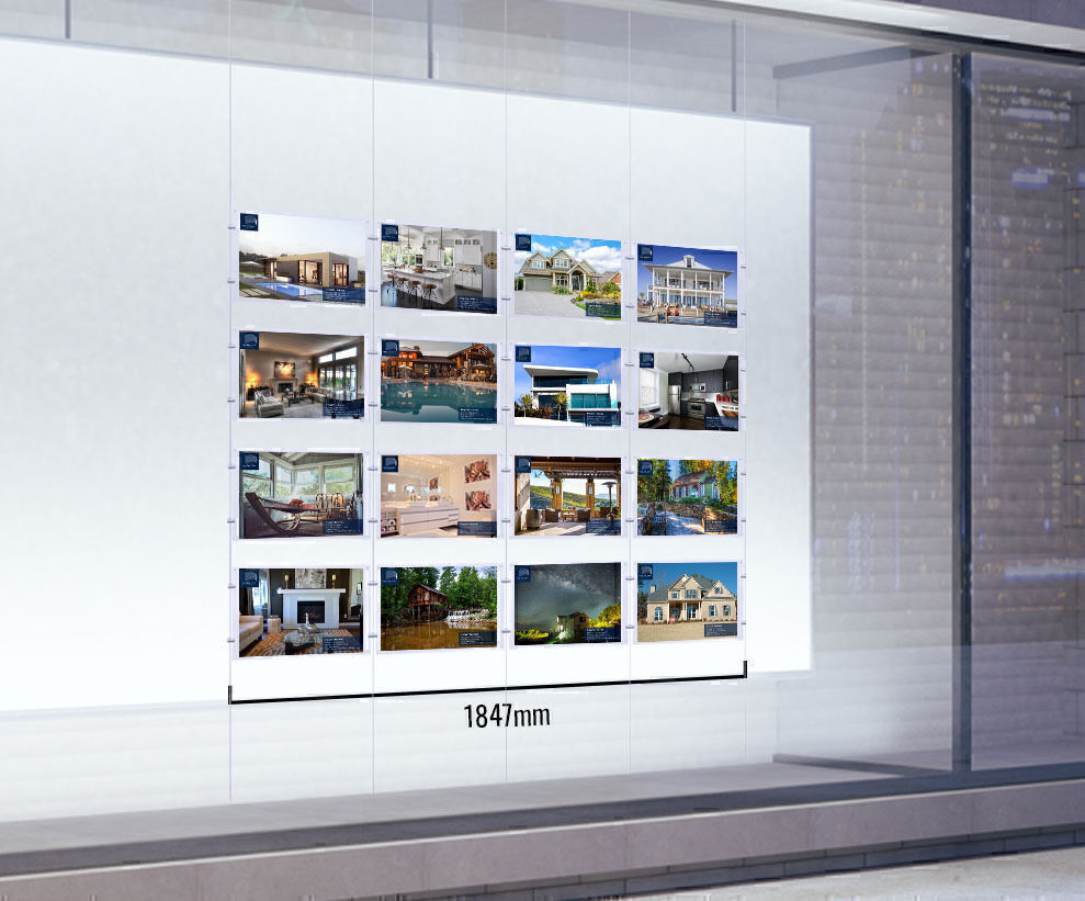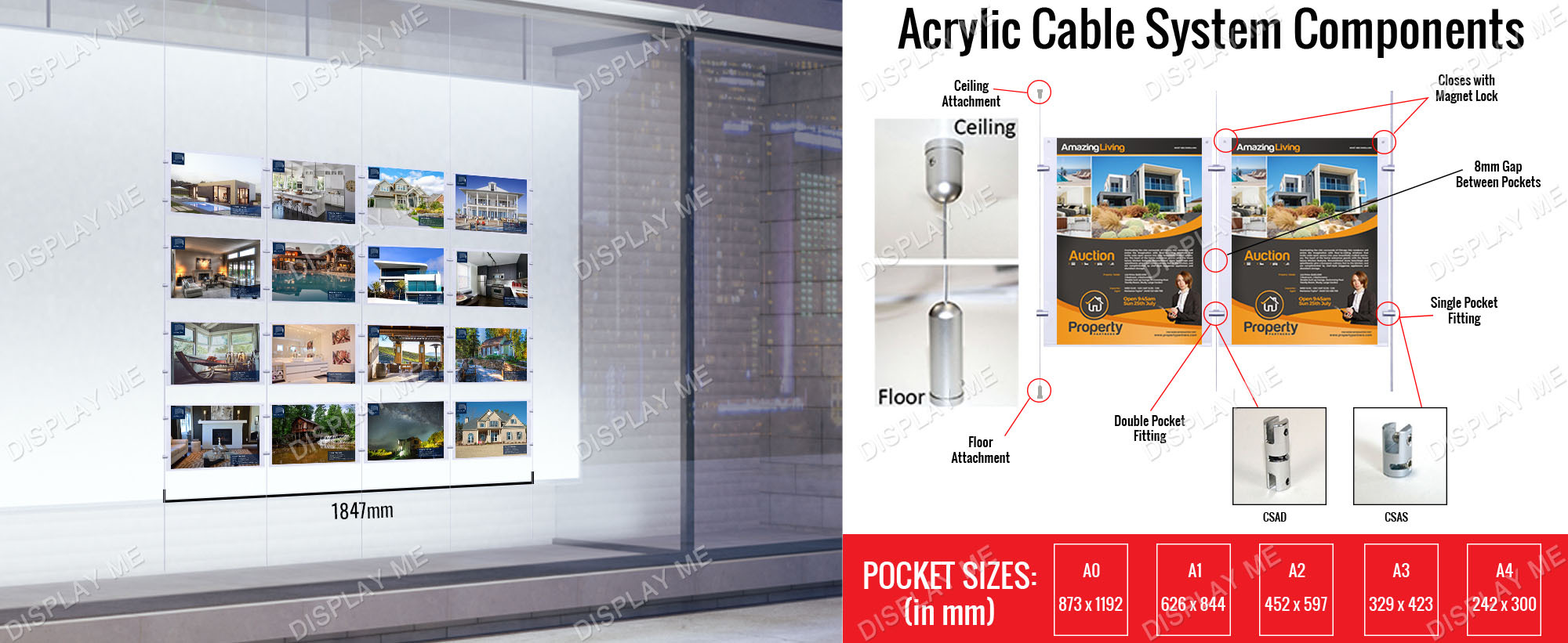 This Window Cable Display, Window Real Estate Displays is a double sided 3mm thick acrylic display attached to a cable system.