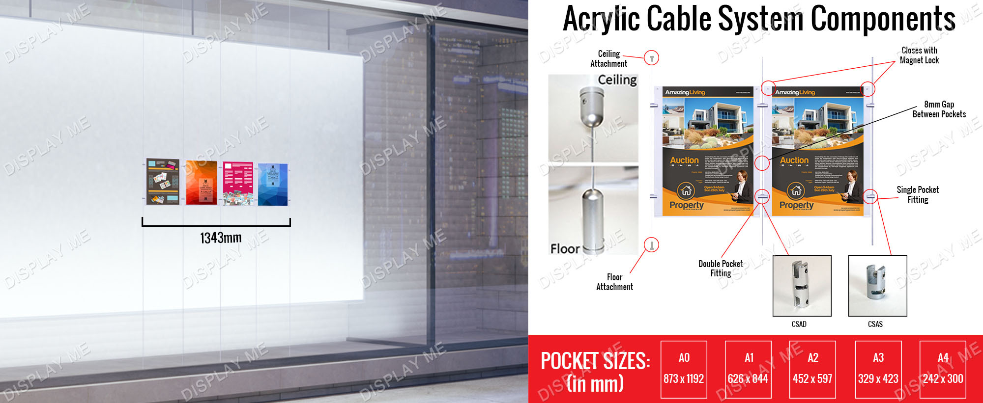 This Window Cable Display, Window Real Estate Displays is a double sided 3mm thick acrylic display attached to a cable system.