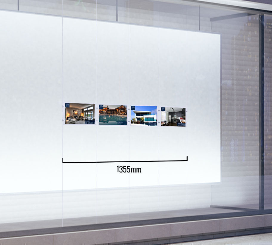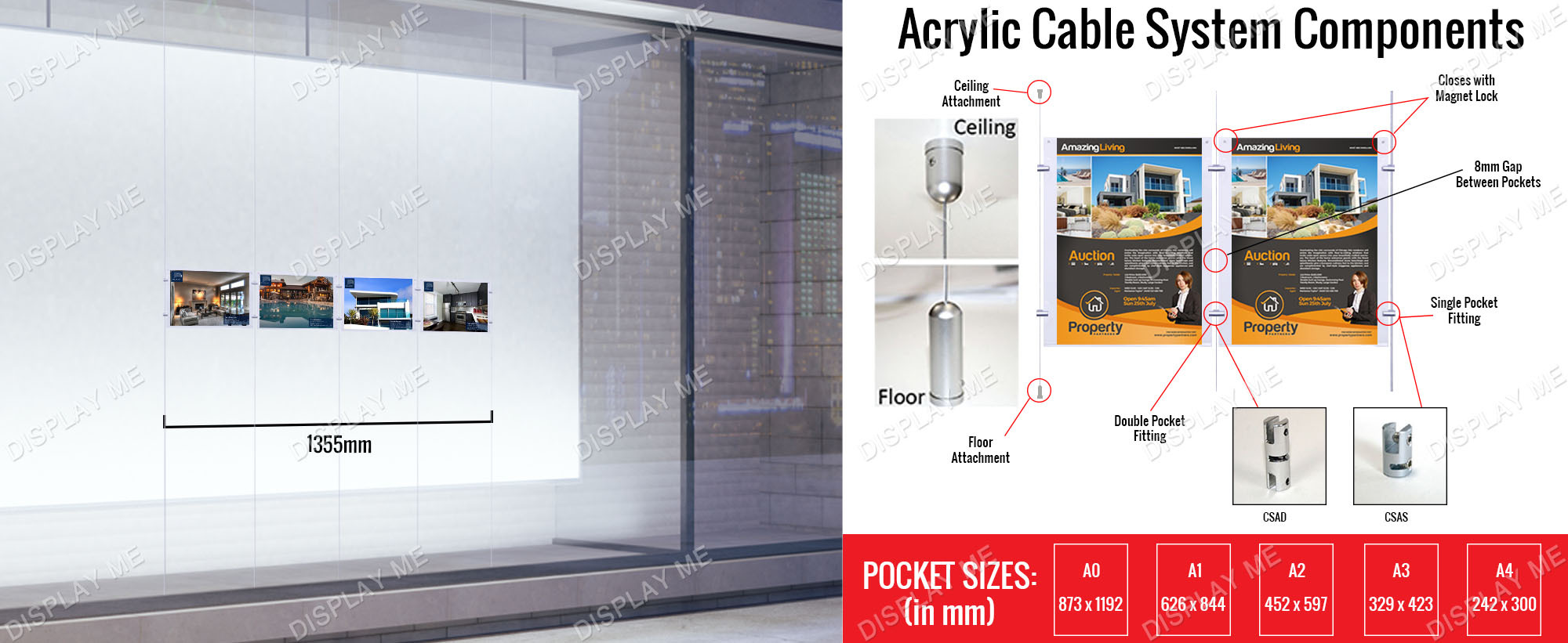 This Window Cable Display, Window Real Estate Displays is a double sided 3mm thick acrylic display attached to a cable system.