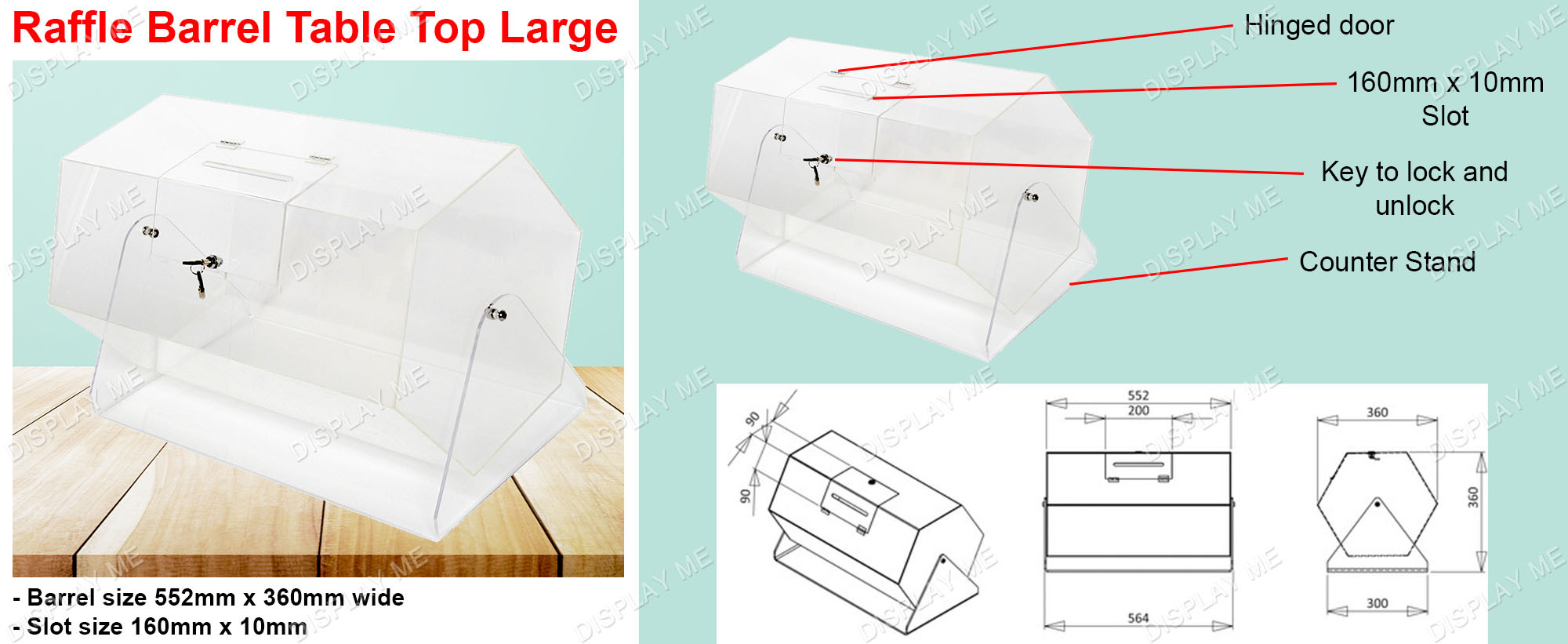 We supply perspex raffle barrels for clubs, pubs, schools, shopping centres and for a wide range of applications.The raffle barel is for table top use. Competition Barrels and Entry Boxes are avilable online now for purchasing.