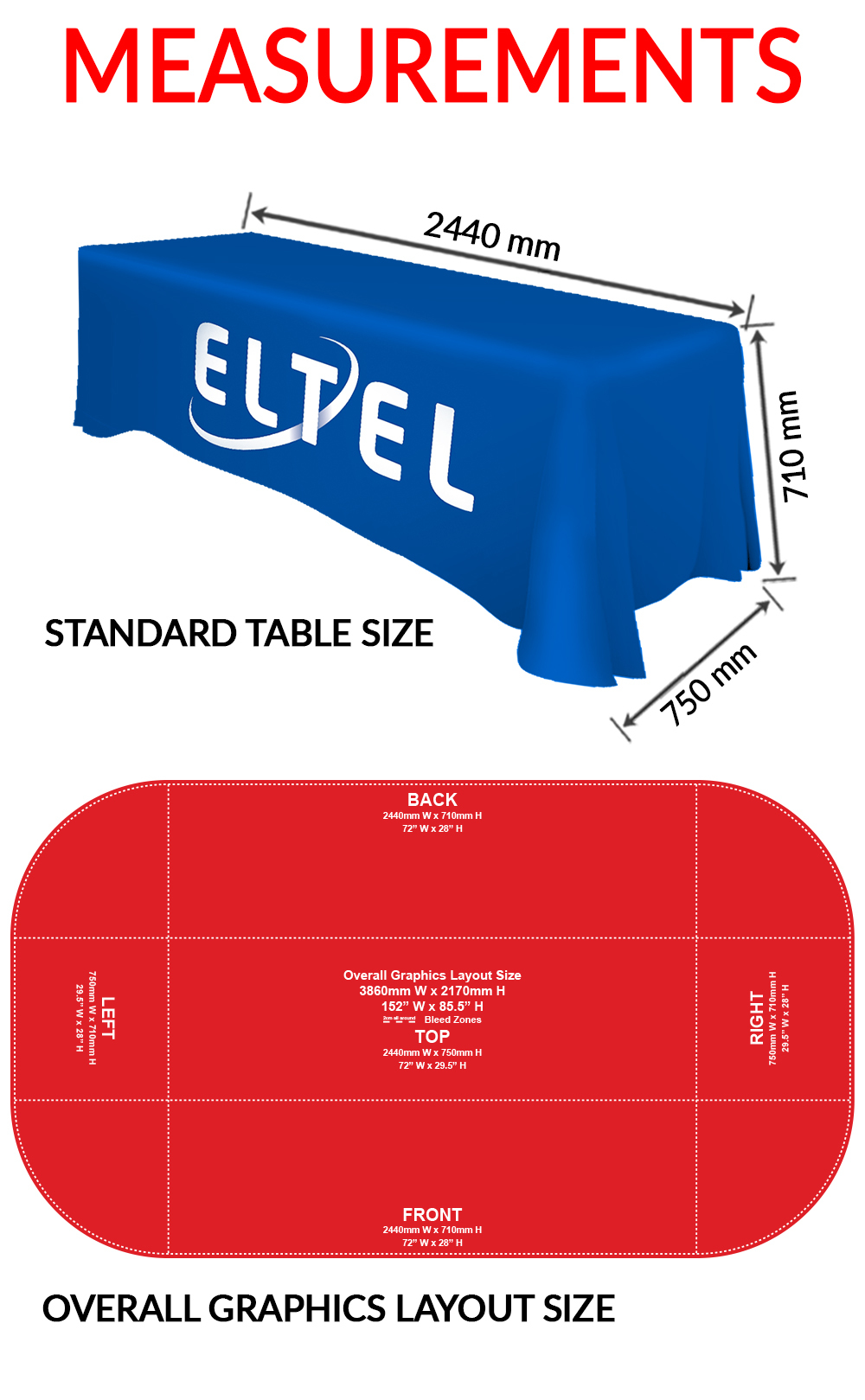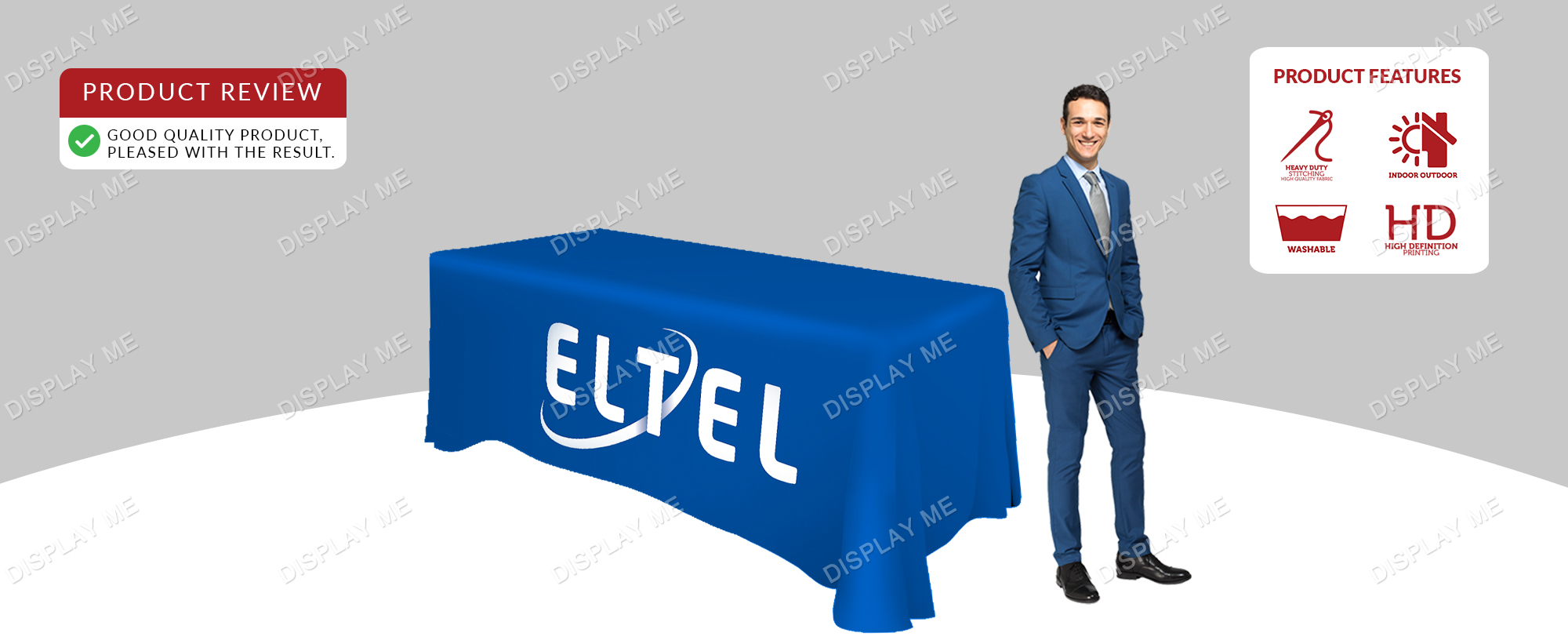 These Rectangular Loose Table Cloths, also known as loose table covers and the perfect accessory for any special event or trade show transforming a simple table to a eye catching full colour high resolution graphic print. These branded table covers are wrinkle free in appearance stretching over the table giving a sleek professional look. The table throws are perfect for trade shows, expos, shopping centres and schools open days displaying your company logo, brand, product or marketing campaign.