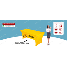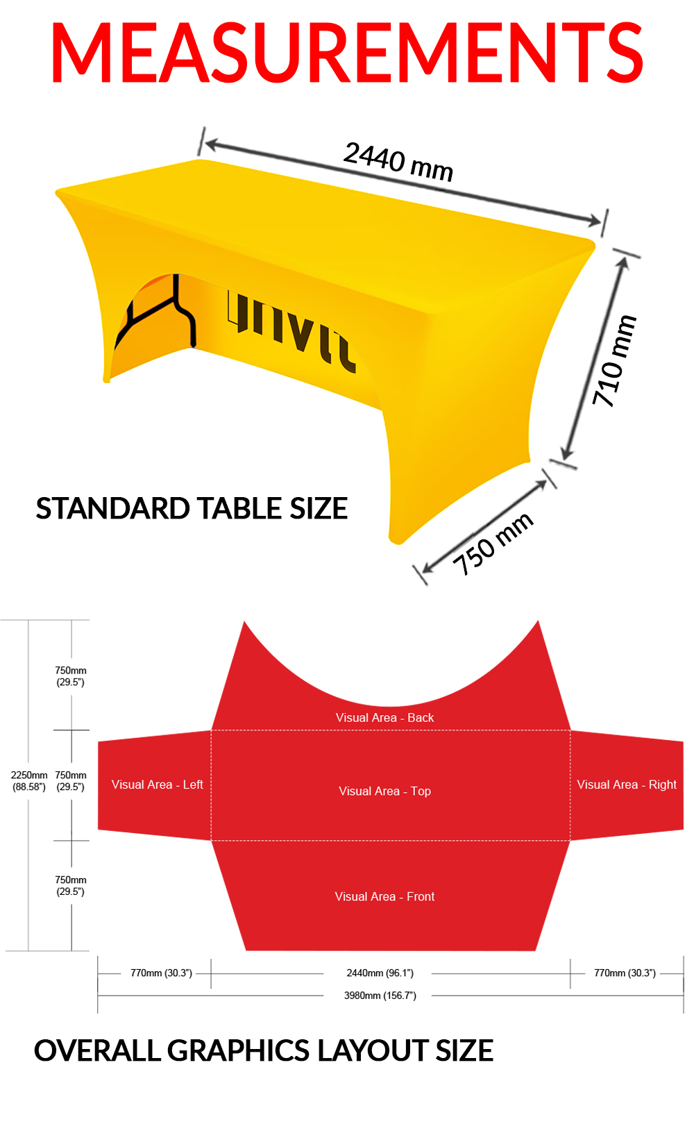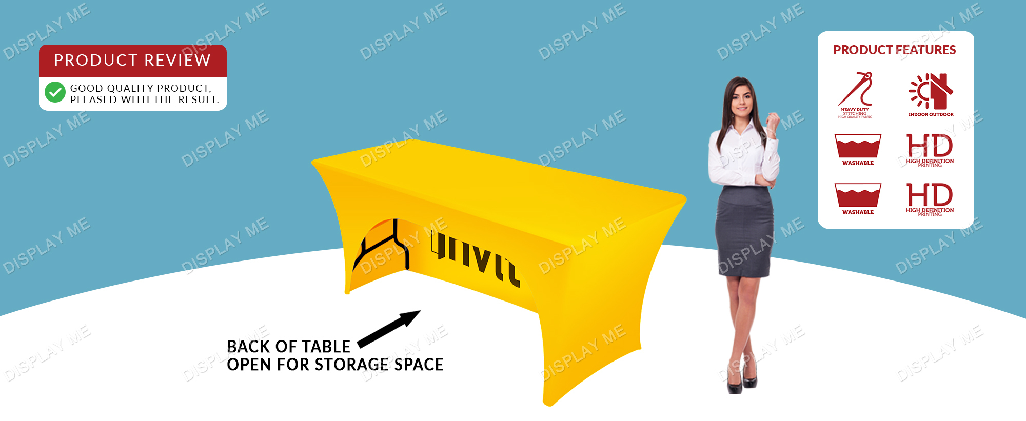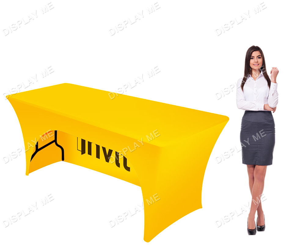 These Rectangular stretch Table Cloths, also known as stretch table covers and the perfect accessory for any special event or trade show transforming a simple table to a eye catching full colour high resolution graphic print. These branded table covers are wrinkle free in appearance stretching over the table giving a sleek professional look. The table throws are perfect for trade shows, expos, shopping centres and schools open days displaying your company logo, brand, product or marketing campaign.