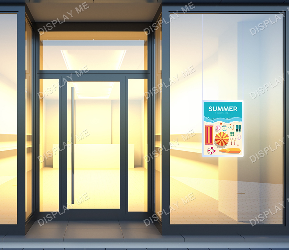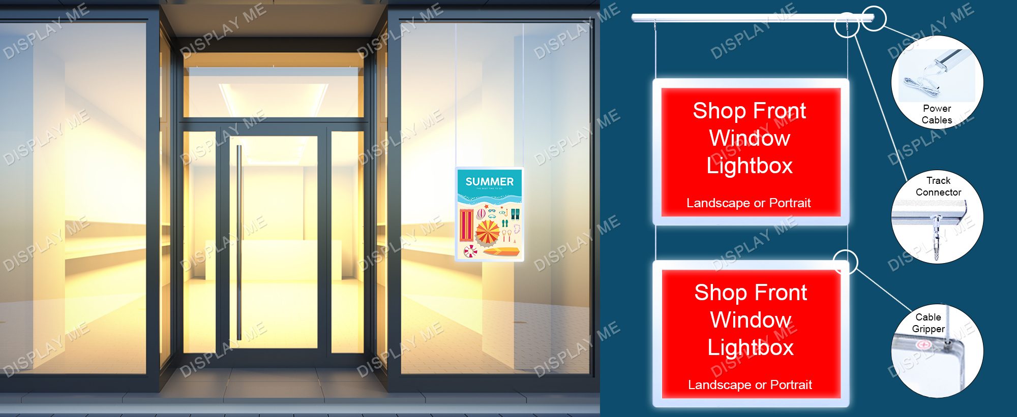 This LED Illuminated Window Light Box Display is ideal for Real Estate Windows, Corporate Offices, Clubs and Brand Promotions. These LED Illuminated Cable Light boxes can be displayed on both sides and give your promotions the attention they need. Each displayed poster is individually covered with a acrylic frame and illuminated by LED giving it a modern elegant look that attracts attention. The posters can be easily changed by using the finger hole and lifting the cover.