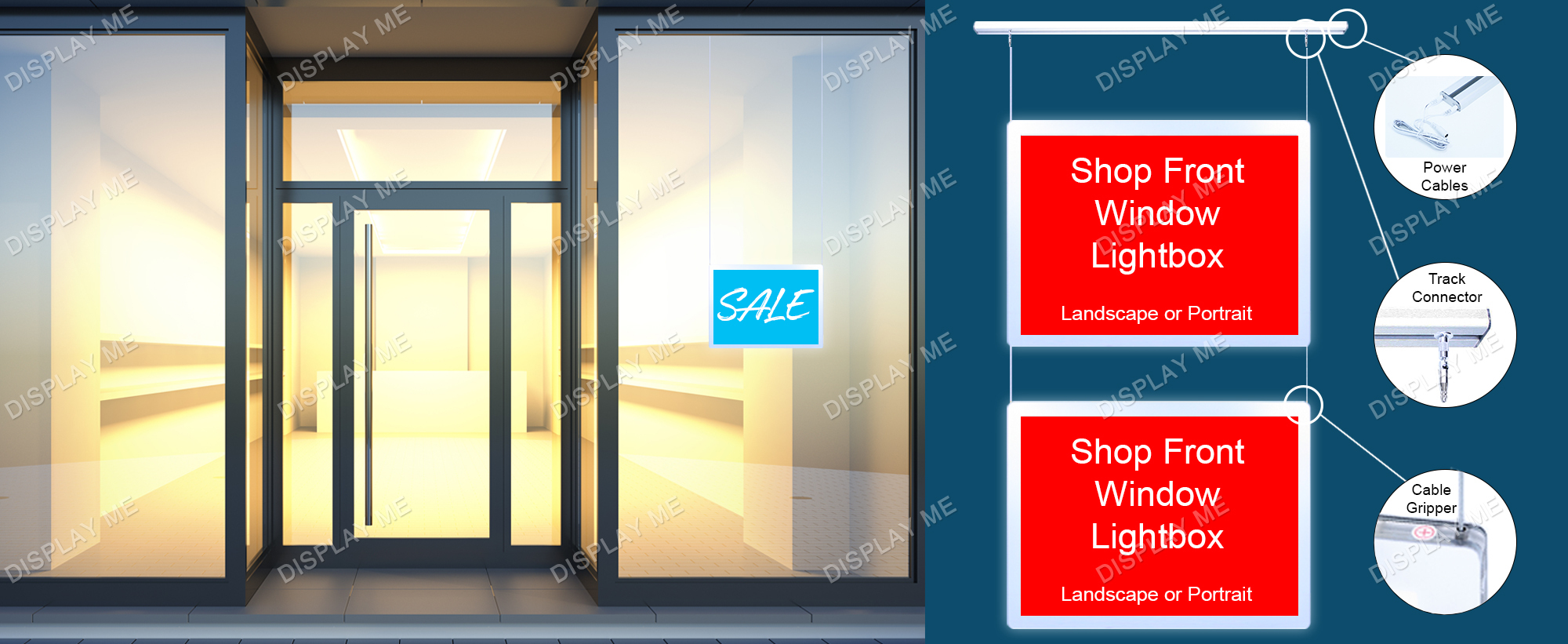 This LED Illuminated Window Light Box Display is ideal for Real Estate Windows, Corporate Offices, Clubs and Brand Promotions. These LED Illuminated Cable Light boxes can be displayed on both sides and give your promotions the attention they need. Each displayed poster is individually covered with a acrylic frame and illuminated by LED giving it a modern elegant look that attracts attention. The posters can be easily changed by using the finger hole and lifting the cover.