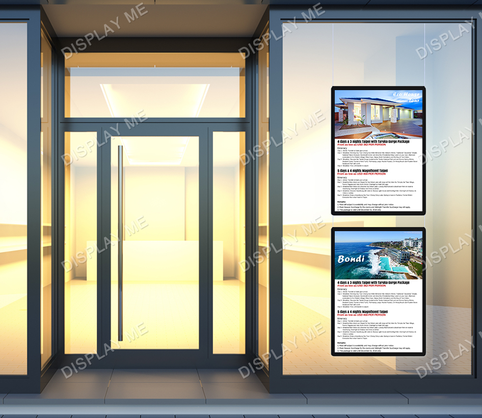 This LED Illuminated Window Light Box Display is ideal for Real Estate Windows, Corporate Offices, Clubs and Brand Promotions. These LED Illuminated Cable Light boxes can be displayed on both sides and give your promotions the attention they need. Each displayed poster is individually covered with a acrylic frame and illuminated by LED giving it a modern elegant look that attracts attention. The posters can be easily changed by using the finger hole and lifting the cover.