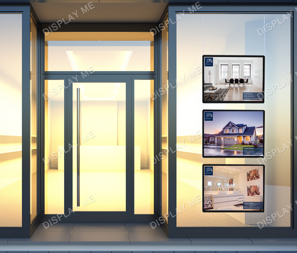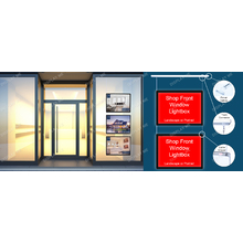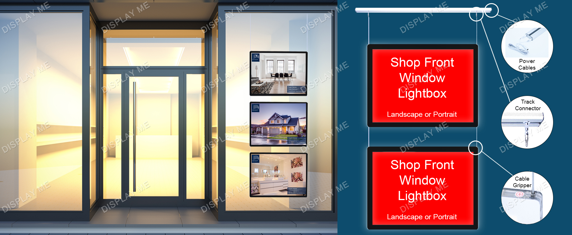 This LED Illuminated Window Light Box Display is ideal for Real Estate Windows, Corporate Offices, Clubs and Brand Promotions. These LED Illuminated Cable Light boxes can be displayed on both sides and give your promotions the attention they need. Each displayed poster is individually covered with a acrylic frame and illuminated by LED giving it a modern elegant look that attracts attention. The posters can be easily changed by using the finger hole and lifting the cover.