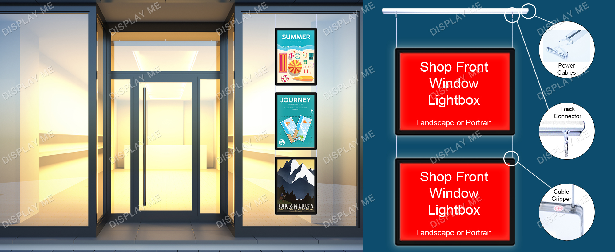 This LED Illuminated Window Light Box Display is ideal for Real Estate Windows, Corporate Offices, Clubs and Brand Promotions. These LED Illuminated Cable Light boxes can be displayed on both sides and give your promotions the attention they need. Each displayed poster is individually covered with a acrylic frame and illuminated by LED giving it a modern elegant look that attracts attention. The posters can be easily changed by using the finger hole and lifting the cover.
