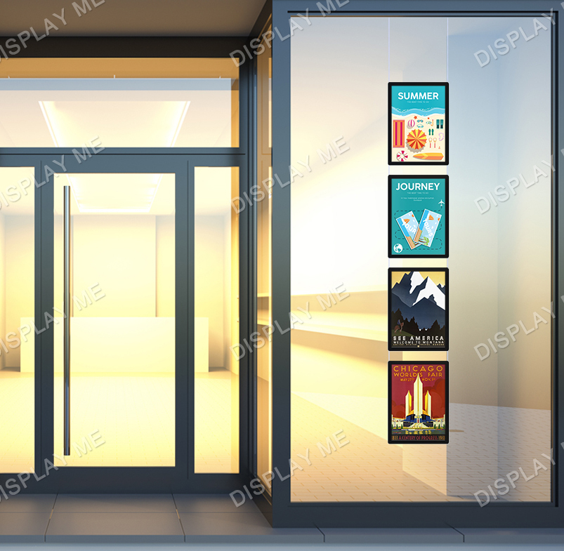 This LED Illuminated Window Light Box Display is ideal for Real Estate Windows, Corporate Offices, Clubs and Brand Promotions. These LED Illuminated Cable Light boxes can be displayed on both sides and give your promotions the attention they need. Each displayed poster is individually covered with a acrylic frame and illuminated by LED giving it a modern elegant look that attracts attention. The posters can be easily changed by using the finger hole and lifting the cover.