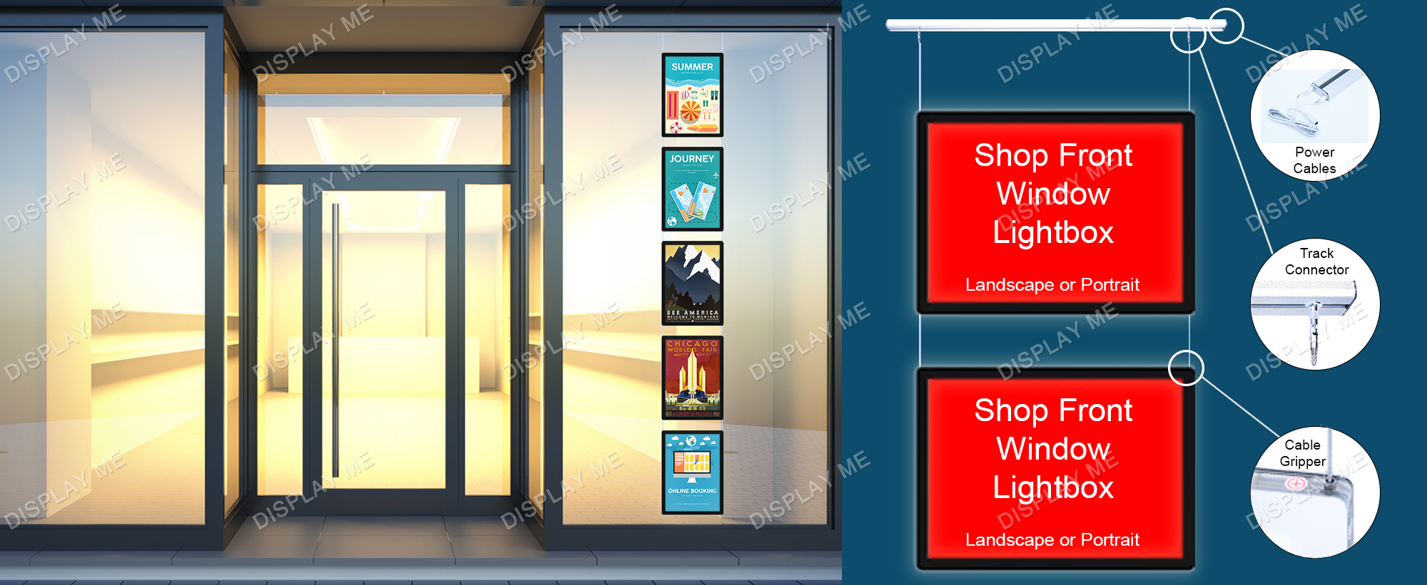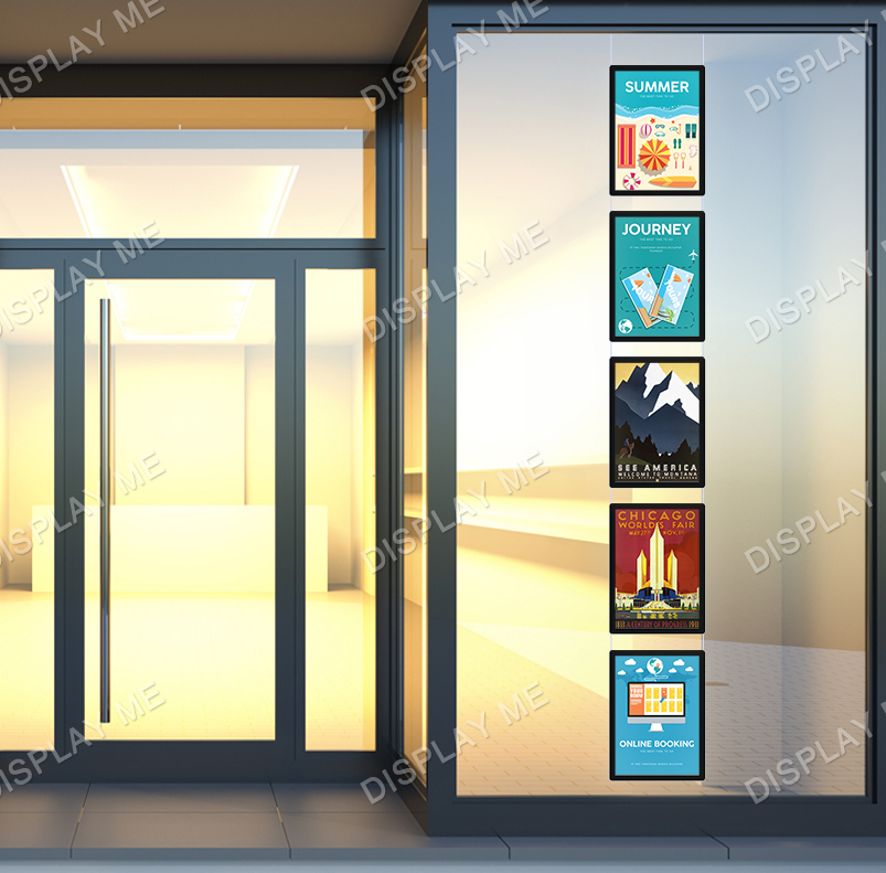 This LED Illuminated Window Light Box Display is ideal for Real Estate Windows, Corporate Offices, Clubs and Brand Promotions. These LED Illuminated Cable Light boxes can be displayed on both sides and give your promotions the attention they need. Each displayed poster is individually covered with a acrylic frame and illuminated by LED giving it a modern elegant look that attracts attention. The posters can be easily changed by using the finger hole and lifting the cover.