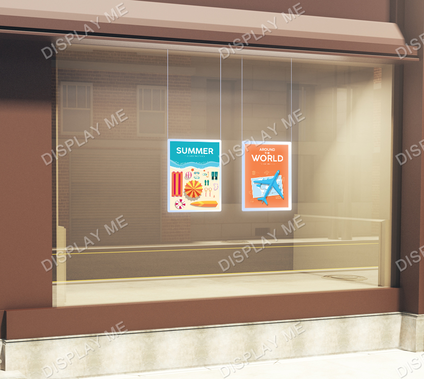 This LED Illuminated Window Light Box Display is ideal for Real Estate Windows, Corporate Offices, Clubs and Brand Promotions. These LED Illuminated Cable Light boxes can be displayed on both sides and give your promotions the attention they need. Each displayed poster is individually covered with a acrylic frame and illuminated by LED giving it a modern elegant look that attracts attention. The posters can be easily changed by using the finger hole and lifting the cover.