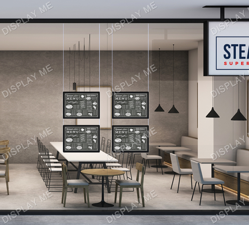 This LED Illuminated Window Light Box Display is ideal for Real Estate Windows, Corporate Offices, Clubs and Brand Promotions. These LED Illuminated Cable Light boxes can be displayed on both sides and give your promotions the attention they need. Each displayed poster is individually covered with a acrylic frame and illuminated by LED giving it a modern elegant look that attracts attention. The posters can be easily changed by using the finger hole and lifting the cover.