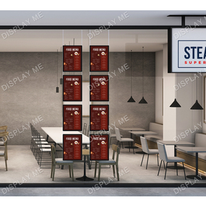 This LED Illuminated Window Light Box Display is ideal for Real Estate Windows, Corporate Offices, Clubs and Brand Promotions. These LED Illuminated Cable Light boxes can be displayed on both sides and give your promotions the attention they need. Each displayed poster is individually covered with a acrylic frame and illuminated by LED giving it a modern elegant look that attracts attention. The posters can be easily changed by using the finger hole and lifting the cover.