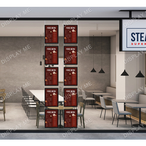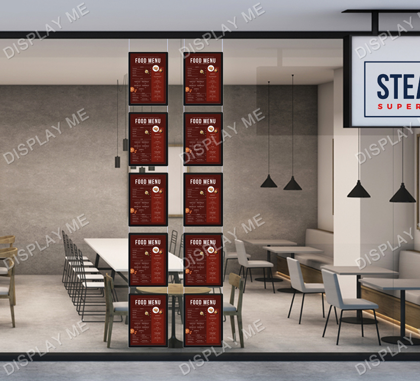 This LED Illuminated Window Light Box Display is ideal for Real Estate Windows, Corporate Offices, Clubs and Brand Promotions. These LED Illuminated Cable Light boxes can be displayed on both sides and give your promotions the attention they need. Each displayed poster is individually covered with a acrylic frame and illuminated by LED giving it a modern elegant look that attracts attention. The posters can be easily changed by using the finger hole and lifting the cover.