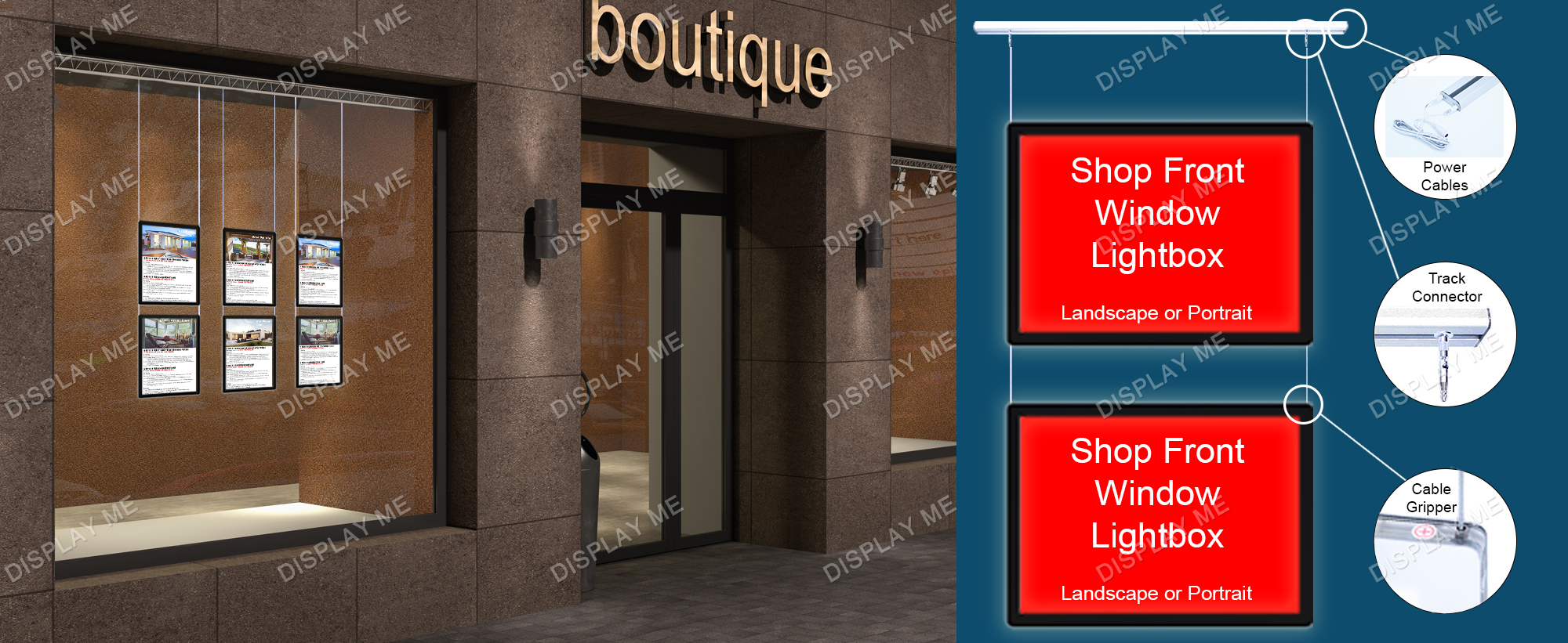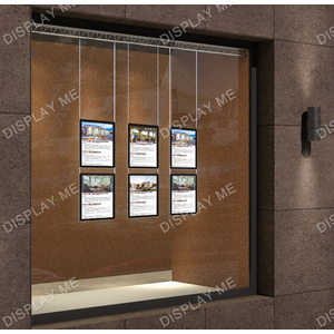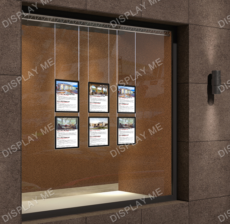This LED Illuminated Window Light Box Display is ideal for Real Estate Windows, Corporate Offices, Clubs and Brand Promotions. These LED Illuminated Cable Light boxes can be displayed on both sides and give your promotions the attention they need. Each displayed poster is individually covered with a acrylic frame and illuminated by LED giving it a modern elegant look that attracts attention. The posters can be easily changed by using the finger hole and lifting the cover.