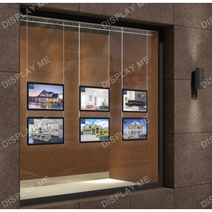 This LED Illuminated Window Light Box Display is ideal for Real Estate Windows, Corporate Offices, Clubs and Brand Promotions. These LED Illuminated Cable Light boxes can be displayed on both sides and give your promotions the attention they need. Each displayed poster is individually covered with a acrylic frame and illuminated by LED giving it a modern elegant look that attracts attention. The posters can be easily changed by using the finger hole and lifting the cover.