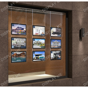 This LED Illuminated Window Light Box Display is ideal for Real Estate Windows, Corporate Offices, Clubs and Brand Promotions. These LED Illuminated Cable Light boxes can be displayed on both sides and give your promotions the attention they need. Each displayed poster is individually covered with a acrylic frame and illuminated by LED giving it a modern elegant look that attracts attention. The posters can be easily changed by using the finger hole and lifting the cover.