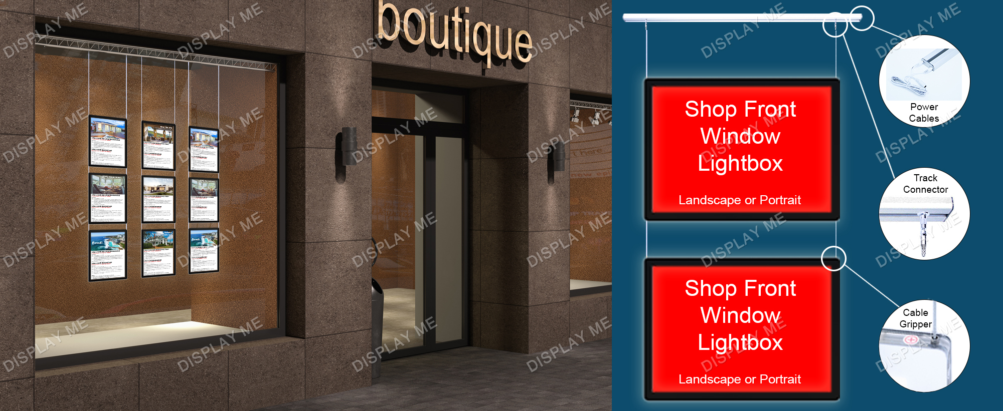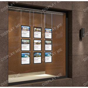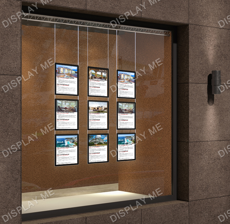 This LED Illuminated Window Light Box Display is ideal for Real Estate Windows, Corporate Offices, Clubs and Brand Promotions. These LED Illuminated Cable Light boxes can be displayed on both sides and give your promotions the attention they need. Each displayed poster is individually covered with a acrylic frame and illuminated by LED giving it a modern elegant look that attracts attention. The posters can be easily changed by using the finger hole and lifting the cover.