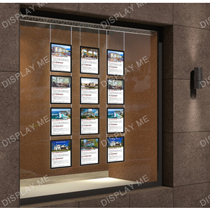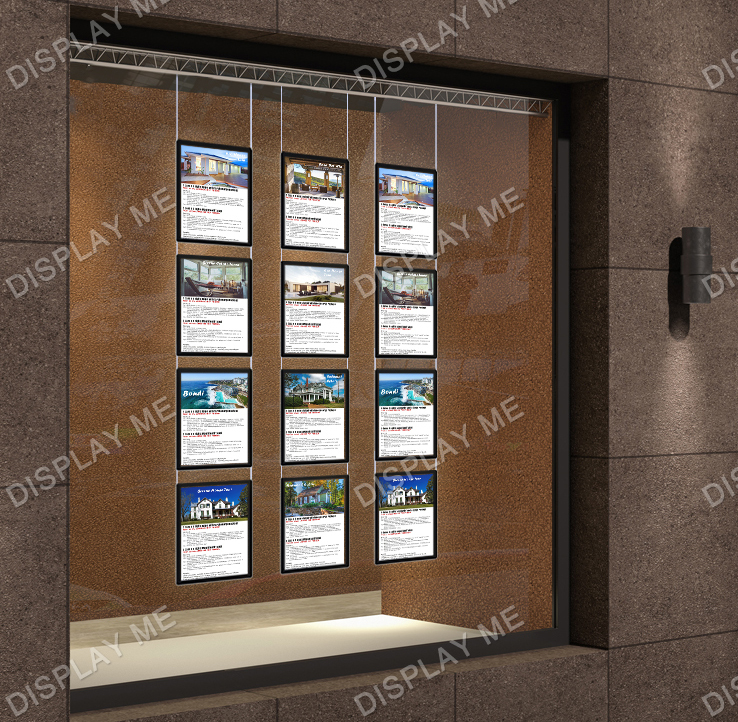 This LED Illuminated Window Light Box Display is ideal for Real Estate Windows, Corporate Offices, Clubs and Brand Promotions. These LED Illuminated Cable Light boxes can be displayed on both sides and give your promotions the attention they need. Each displayed poster is individually covered with a acrylic frame and illuminated by LED giving it a modern elegant look that attracts attention. The posters can be easily changed by using the finger hole and lifting the cover.