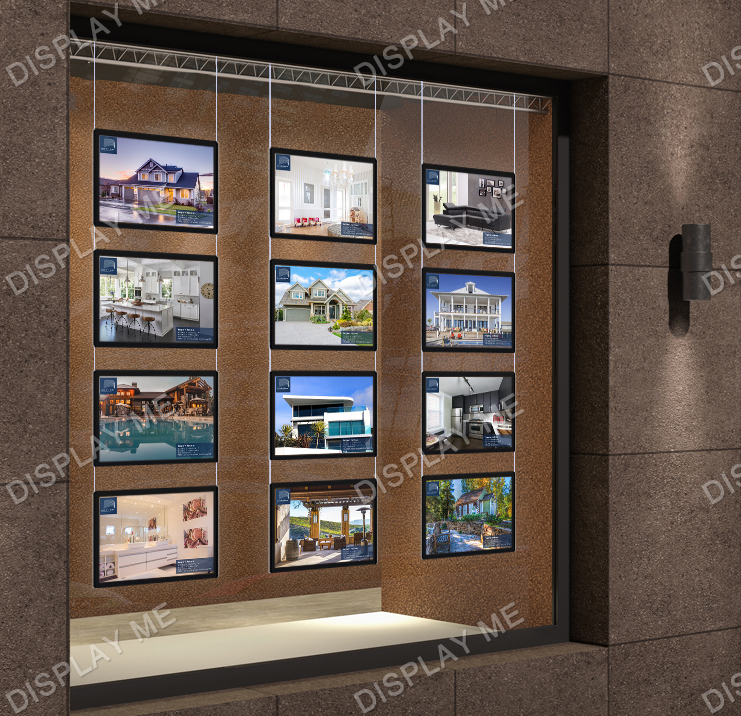 This LED Illuminated Window Light Box Display is ideal for Real Estate Windows, Corporate Offices, Clubs and Brand Promotions. These LED Illuminated Cable Light boxes can be displayed on both sides and give your promotions the attention they need. Each displayed poster is individually covered with a acrylic frame and illuminated by LED giving it a modern elegant look that attracts attention. The posters can be easily changed by using the finger hole and lifting the cover.