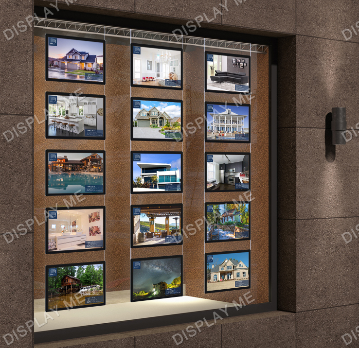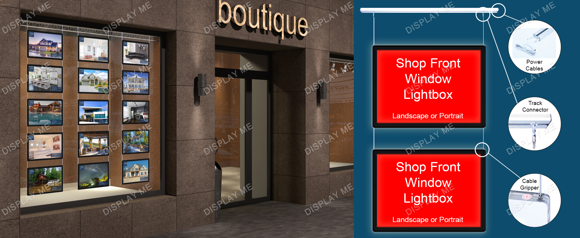 This LED Illuminated Window Light Box Display is ideal for Real Estate Windows, Corporate Offices, Clubs and Brand Promotions. These LED Illuminated Cable Light boxes can be displayed on both sides and give your promotions the attention they need. Each displayed poster is individually covered with a acrylic frame and illuminated by LED giving it a modern elegant look that attracts attention. The posters can be easily changed by using the finger hole and lifting the cover.