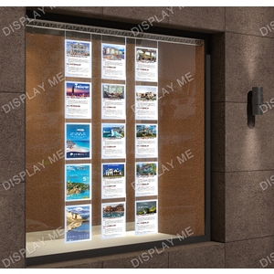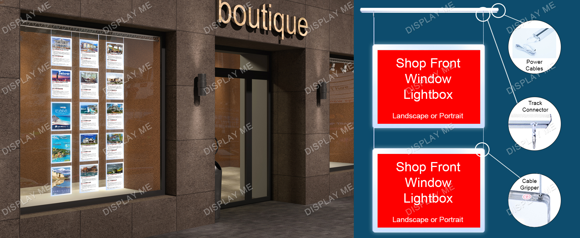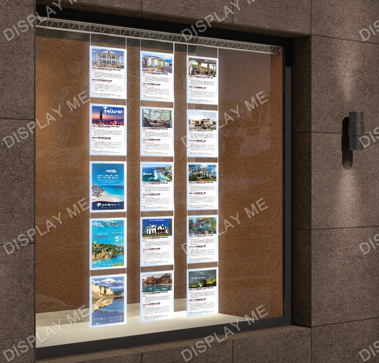 This LED Illuminated Window Light Box Display is ideal for Real Estate Windows, Corporate Offices, Clubs and Brand Promotions. These LED Illuminated Cable Light boxes can be displayed on both sides and give your promotions the attention they need. Each displayed poster is individually covered with a acrylic frame and illuminated by LED giving it a modern elegant look that attracts attention. The posters can be easily changed by using the finger hole and lifting the cover.