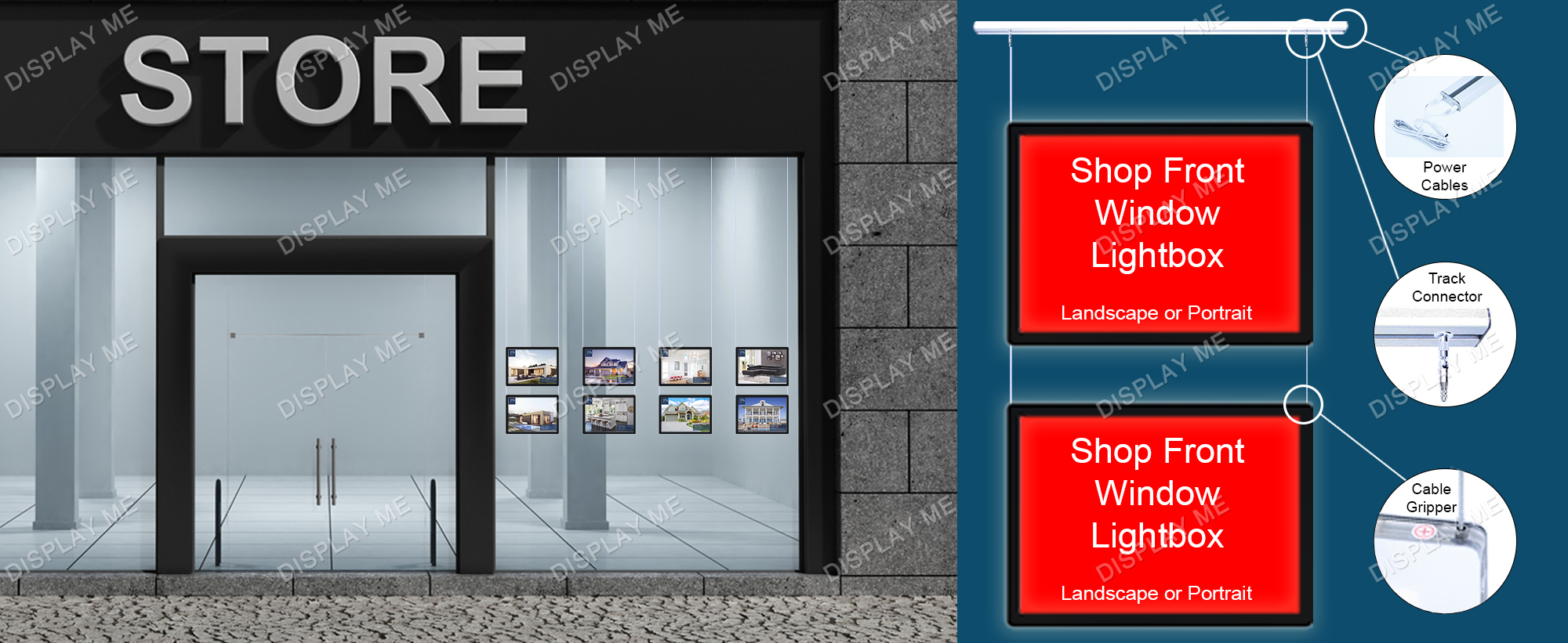 This LED Illuminated Window Light Box Display is ideal for Real Estate Windows, Corporate Offices, Clubs and Brand Promotions. These LED Illuminated Cable Light boxes can be displayed on both sides and give your promotions the attention they need. Each displayed poster is individually covered with a acrylic frame and illuminated by LED giving it a modern elegant look that attracts attention. The posters can be easily changed by using the finger hole and lifting the cover.