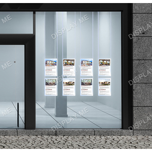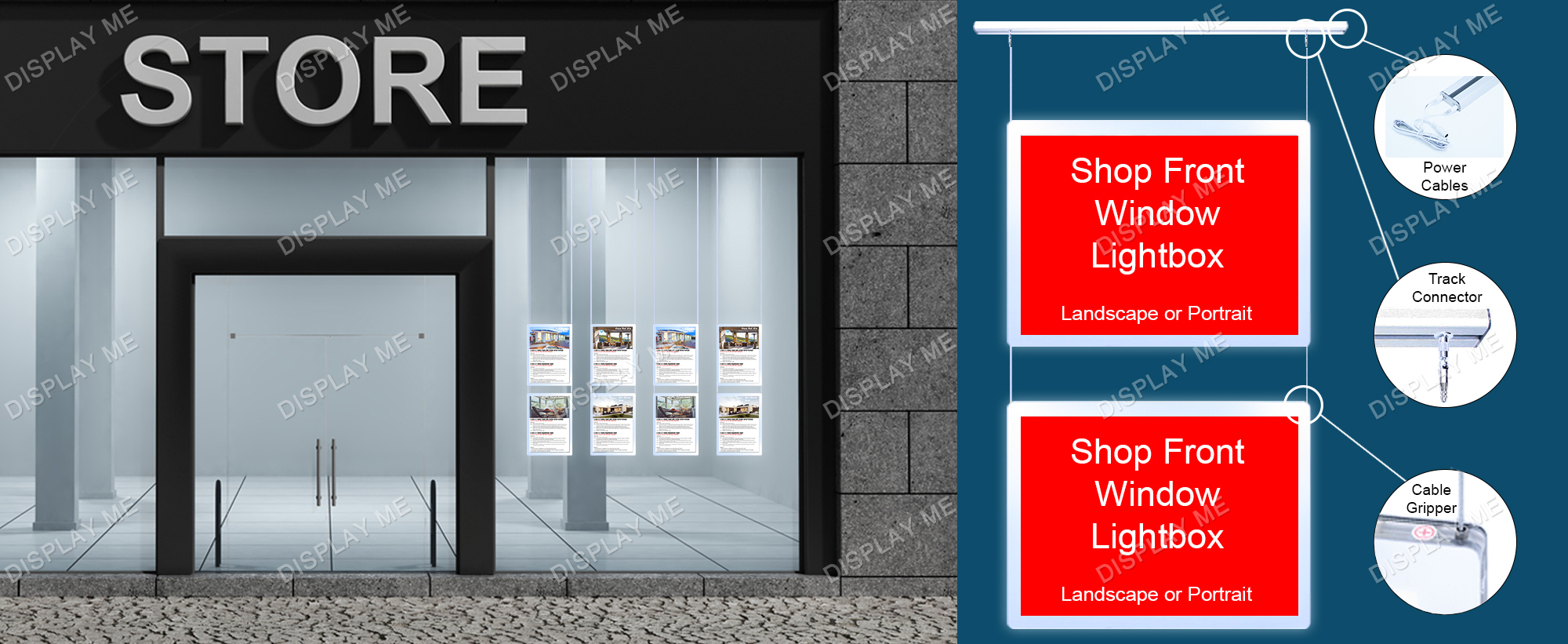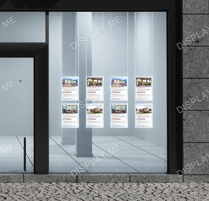 This LED Illuminated Window Light Box Display is ideal for Real Estate Windows, Corporate Offices, Clubs and Brand Promotions. These LED Illuminated Cable Light boxes can be displayed on both sides and give your promotions the attention they need. Each displayed poster is individually covered with a acrylic frame and illuminated by LED giving it a modern elegant look that attracts attention. The posters can be easily changed by using the finger hole and lifting the cover.