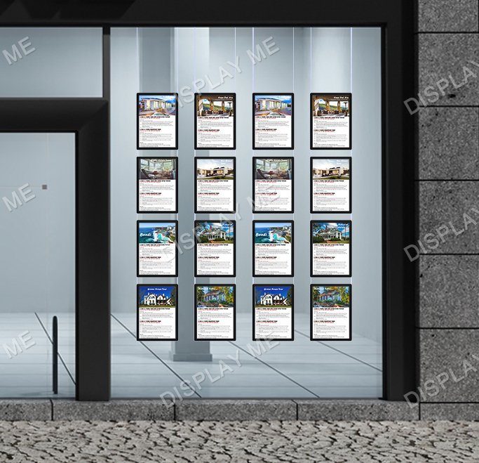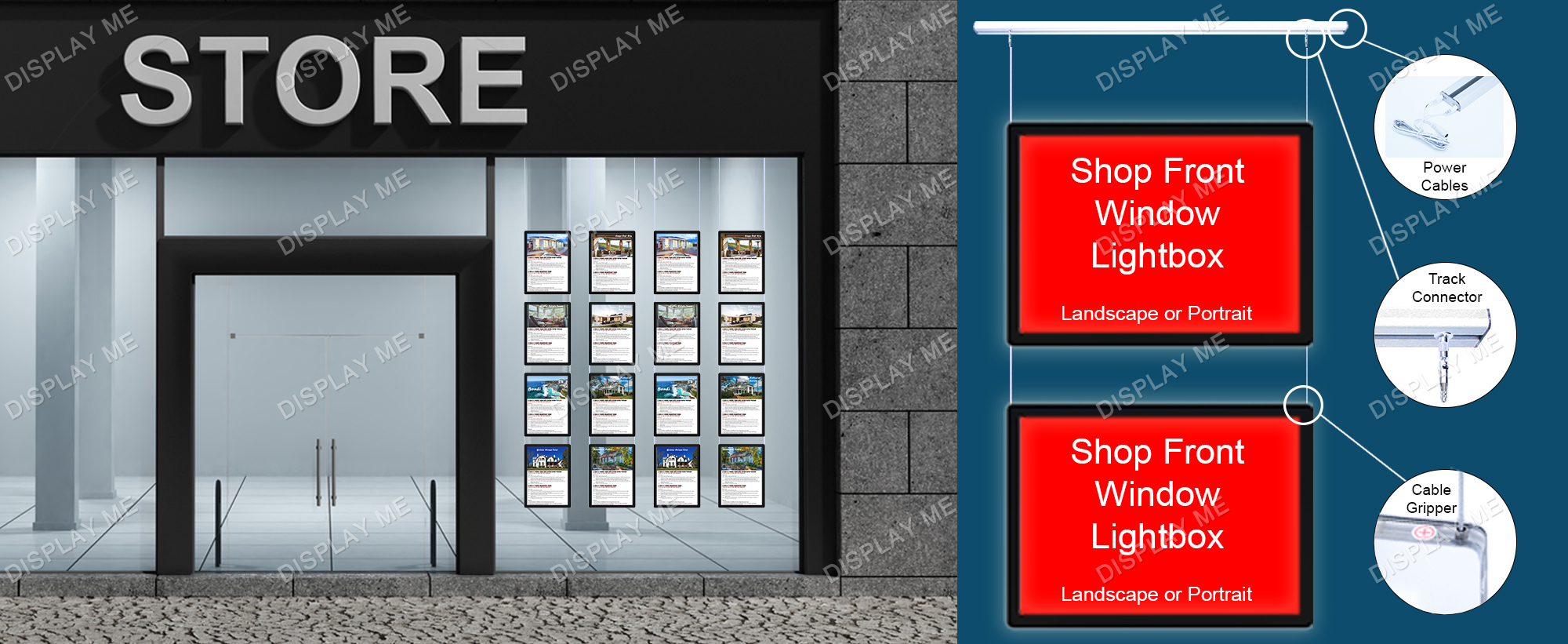 This LED Illuminated Window Light Box Display is ideal for Real Estate Windows, Corporate Offices, Clubs and Brand Promotions. These LED Illuminated Cable Light boxes can be displayed on both sides and give your promotions the attention they need. Each displayed poster is individually covered with a acrylic frame and illuminated by LED giving it a modern elegant look that attracts attention. The posters can be easily changed by using the finger hole and lifting the cover.