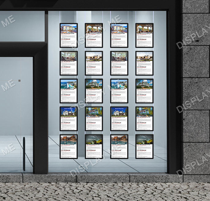 This LED Illuminated Window Light Box Display is ideal for Real Estate Windows, Corporate Offices, Clubs and Brand Promotions. These LED Illuminated Cable Light boxes can be displayed on both sides and give your promotions the attention they need. Each displayed poster is individually covered with a acrylic frame and illuminated by LED giving it a modern elegant look that attracts attention. The posters can be easily changed by using the finger hole and lifting the cover.