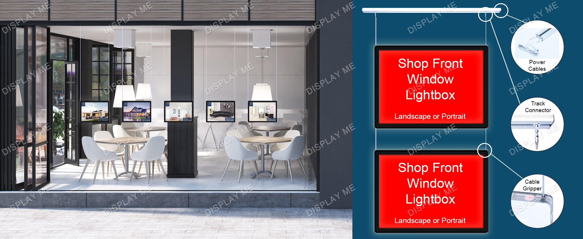 This LED Illuminated Window Light Box Display is ideal for Real Estate Windows, Corporate Offices, Clubs and Brand Promotions. These LED Illuminated Cable Light boxes can be displayed on both sides and give your promotions the attention they need. Each displayed poster is individually covered with a acrylic frame and illuminated by LED giving it a modern elegant look that attracts attention. The posters can be easily changed by using the finger hole and lifting the cover.