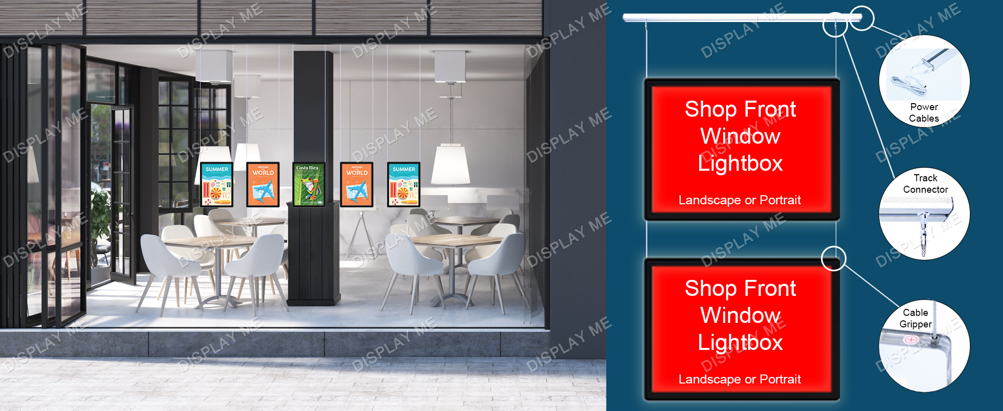 This LED Illuminated Window Light Box Display is ideal for Real Estate Windows, Corporate Offices, Clubs and Brand Promotions. These LED Illuminated Cable Light boxes can be displayed on both sides and give your promotions the attention they need. Each displayed poster is individually covered with a acrylic frame and illuminated by LED giving it a modern elegant look that attracts attention. The posters can be easily changed by using the finger hole and lifting the cover.