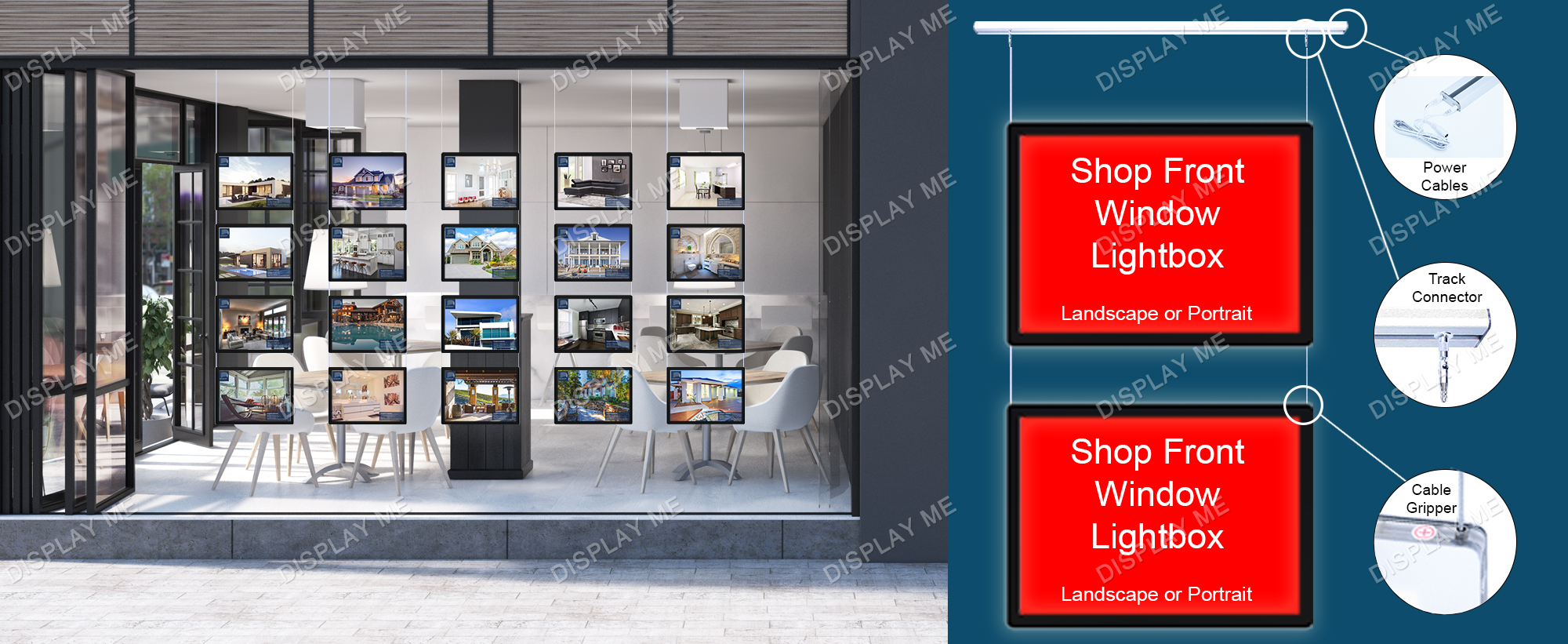 This LED Illuminated Window Light Box Display is ideal for Real Estate Windows, Corporate Offices, Clubs and Brand Promotions. These LED Illuminated Cable Light boxes can be displayed on both sides and give your promotions the attention they need. Each displayed poster is individually covered with a acrylic frame and illuminated by LED giving it a modern elegant look that attracts attention. The posters can be easily changed by using the finger hole and lifting the cover.