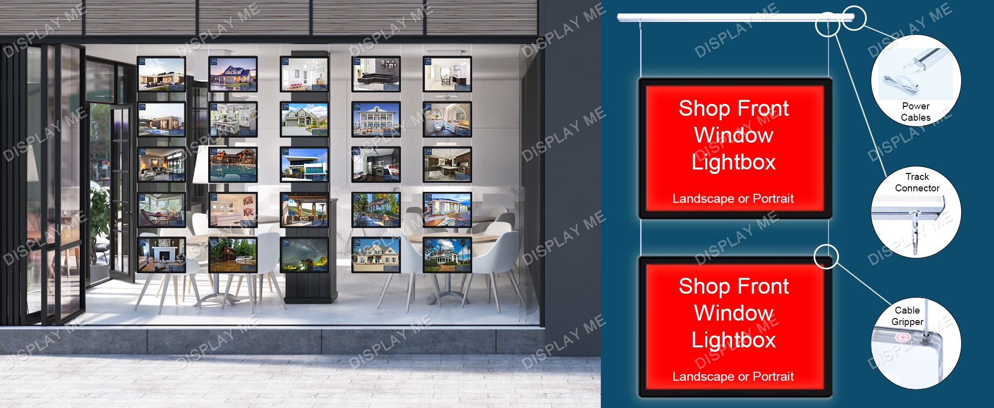 This LED Illuminated Window Light Box Display is ideal for Real Estate Windows, Corporate Offices, Clubs and Brand Promotions. These LED Illuminated Cable Light boxes can be displayed on both sides and give your promotions the attention they need. Each displayed poster is individually covered with a acrylic frame and illuminated by LED giving it a modern elegant look that attracts attention. The posters can be easily changed by using the finger hole and lifting the cover.