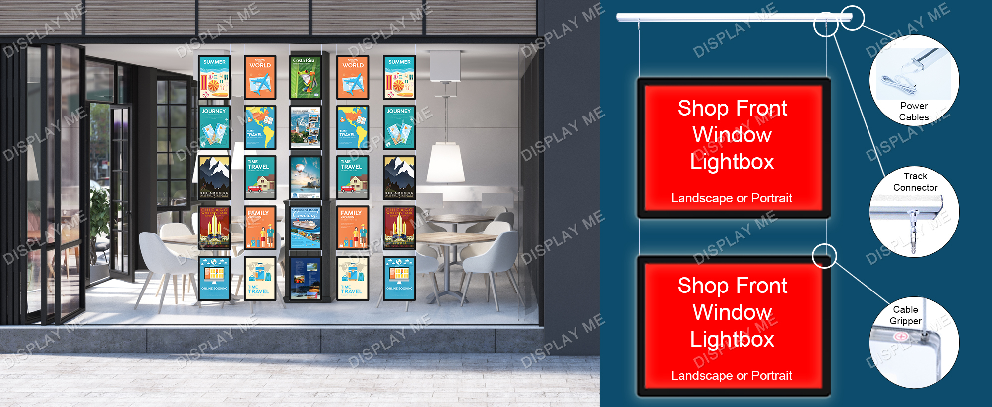 This LED Illuminated Window Light Box Display is ideal for Real Estate Windows, Corporate Offices, Clubs and Brand Promotions. These LED Illuminated Cable Light boxes can be displayed on both sides and give your promotions the attention they need. Each displayed poster is individually covered with a acrylic frame and illuminated by LED giving it a modern elegant look that attracts attention. The posters can be easily changed by using the finger hole and lifting the cover.