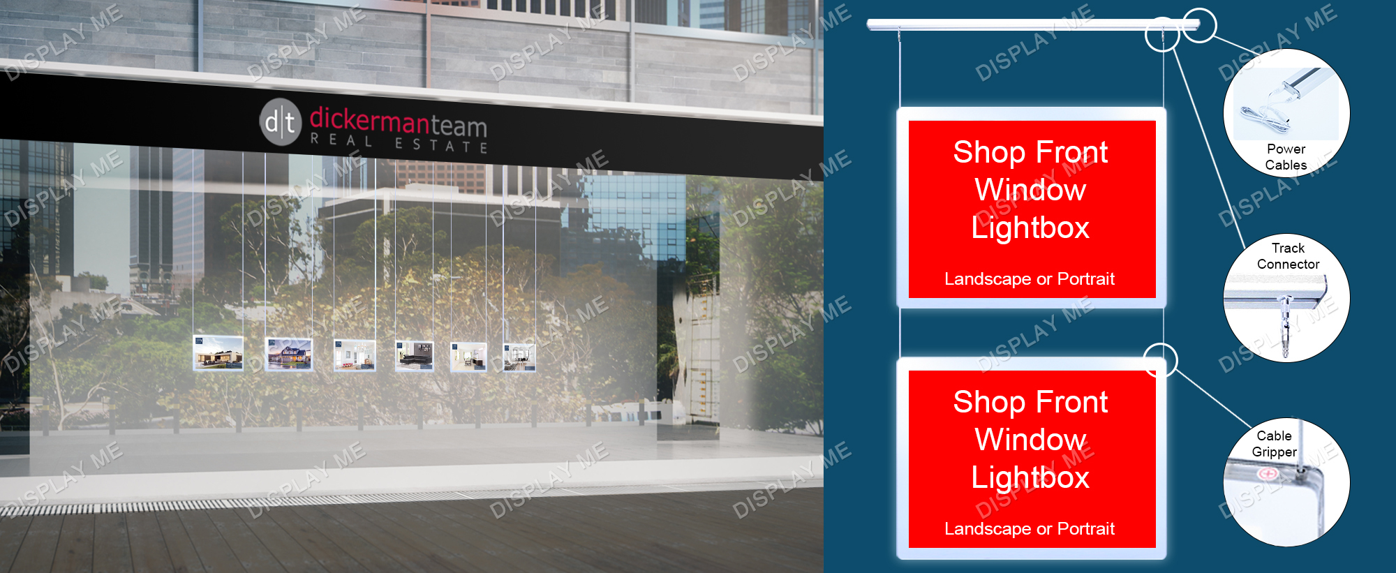 This LED Illuminated Window Light Box Display is ideal for Real Estate Windows, Corporate Offices, Clubs and Brand Promotions. These LED Illuminated Cable Light boxes can be displayed on both sides and give your promotions the attention they need. Each displayed poster is individually covered with a acrylic frame and illuminated by LED giving it a modern elegant look that attracts attention. The posters can be easily changed by using the finger hole and lifting the cover.